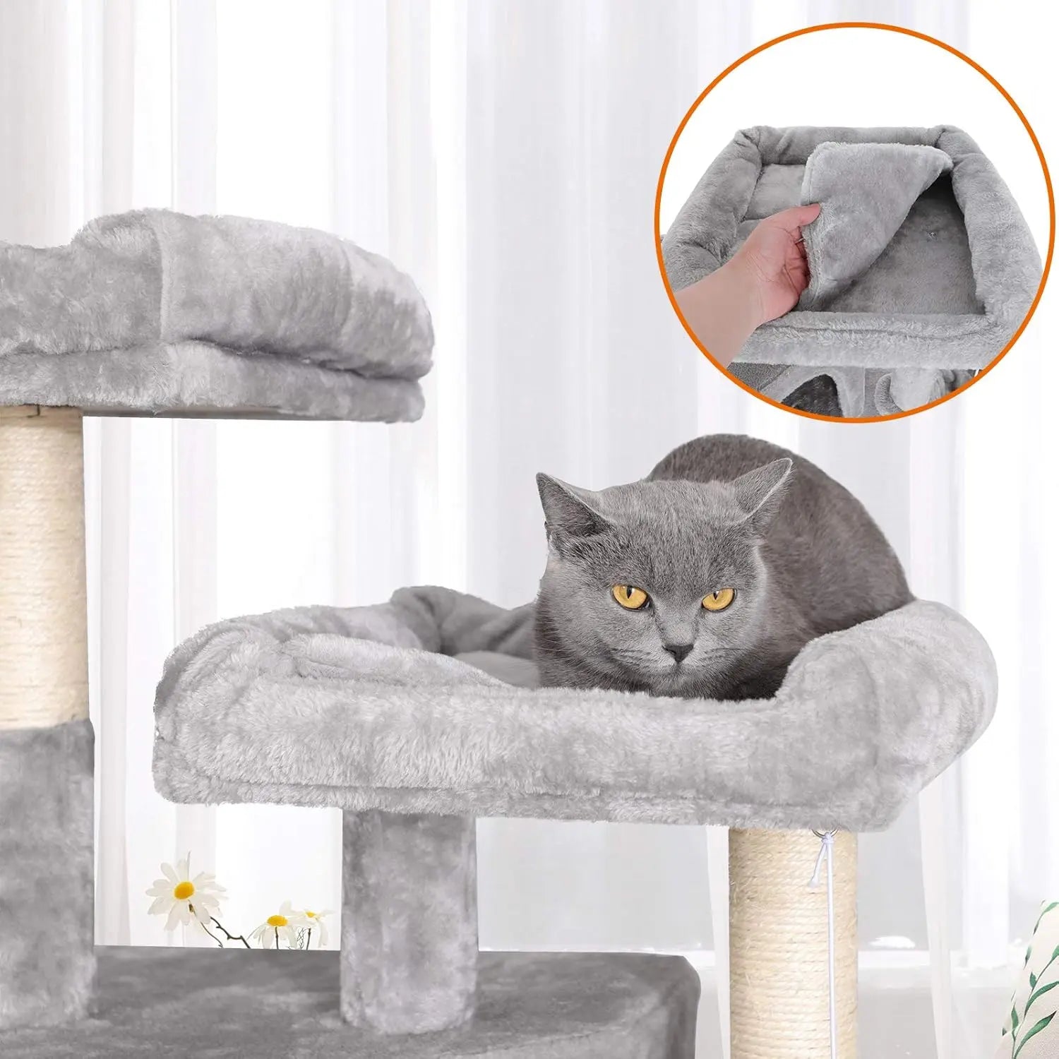Ob verspielte Kätzchen oder gemütliche Senioren – die durchdachte Anordnung der Elemente ermöglicht es Katzen jeden Alters, mühelos zu klettern und zu erkunden. Die hochwertigen Materialien, darunter dicker Plüsch, kratzfestes Sisal und robuste MDF / Spanplatte-Platten, garantieren nicht nur Langlebigkeit, sondern auch den ultimativen Komfort für selbst die wählerischsten Stubentiger.