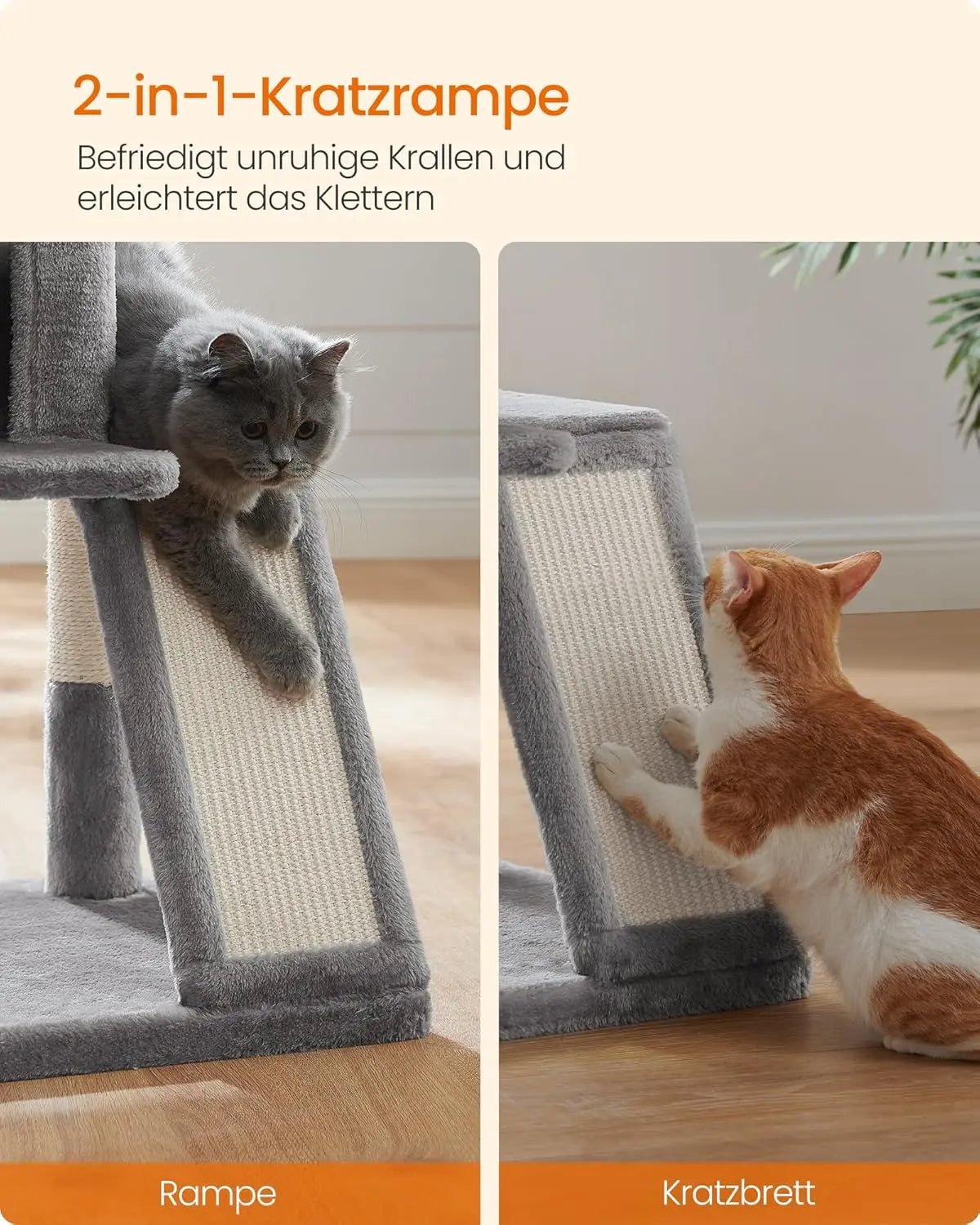 Dieser innovative Kratzbaum vereint Funktionalität und Spielspass dank seiner 2-in-1-Kratzrampe. Das integrierte Kratzbrett ermöglicht es Ihren Katzen, ihren natürlichen Kratzinstinkt auszuleben, während die Rampe besonders Kätzchen und älteren Katzen das Hinaufklettern erleichtert. So wird jeder Sprung zum Kinderspiel!