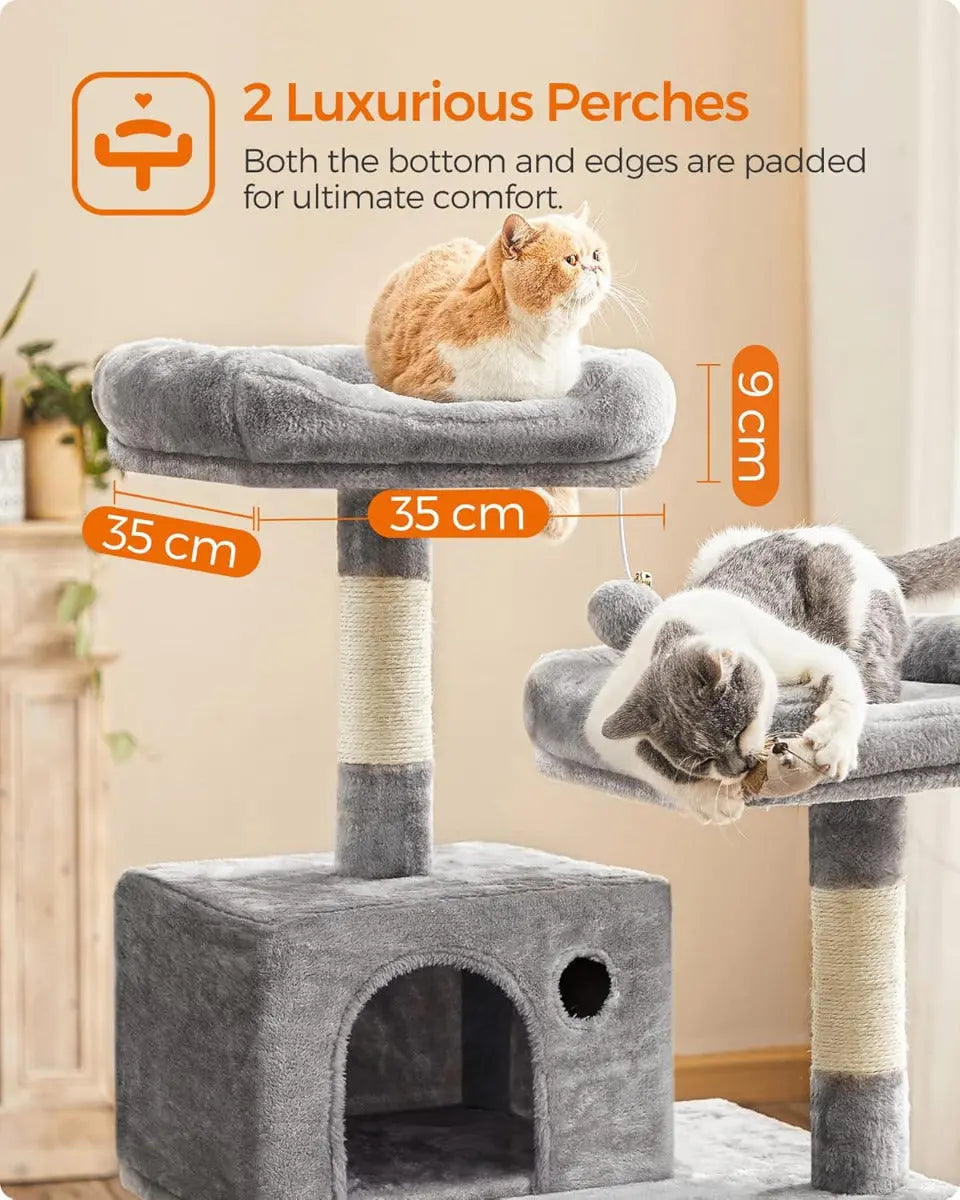 Zusätzlich sorgt ein Sisalseil und zwei hängende Plüschbälle für noch mehr Spielspass. Die Glöckchen an den Bällen wecken die Neugier Ihrer Katzen und garantieren stundenlange Unterhaltung. Das mehrstufige Design ermöglicht es Katzen jeden Alters, problemlos auf- und abzusteigen, was für ein aufregendes Kletterabenteuer sorgt.