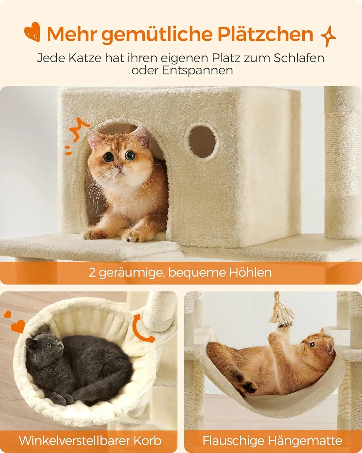 Der All-in-One-Spielplatz bietet vielfältige Rückzugs- und Ruheplätze: zwei gut gepolsterte Plattformen zum Beobachten und Dösen, zwei kuschelige Höhlen für ungestörte Ruhephasen, ein flauschiger Korb für gemütliche Nickerchen und eine stabile Hängematte für entspannte Schaukelerlebnisse; zwei Plüschbälle plus zwei Ersatz-Plüschbälle (praktisch, wenn es einmal wild wird oder Sie ein anderes Klangprofil bevorzugen) sorgen für zusätzliche Beschäftigung und animieren zum Spielen. Die Verarbeitung mit Qualitätsspanplatten, einer grossen Basis mit verstärkten Bodenleisten und dem mitgelieferten Kippschutz garantiert sicheren Stand auch bei ausgelassenen Spielphasen, während die sinnvolle Anordnung der Kratz- und Liegeflächen ideal auf mehrere Katzen abgestimmt ist und territorialen Konflikten entgegenwirkt.