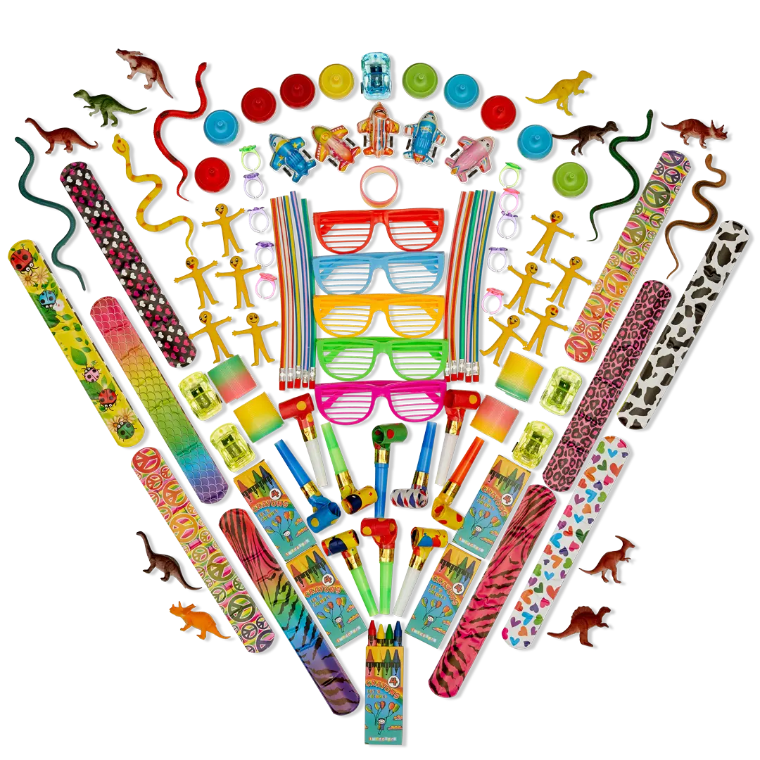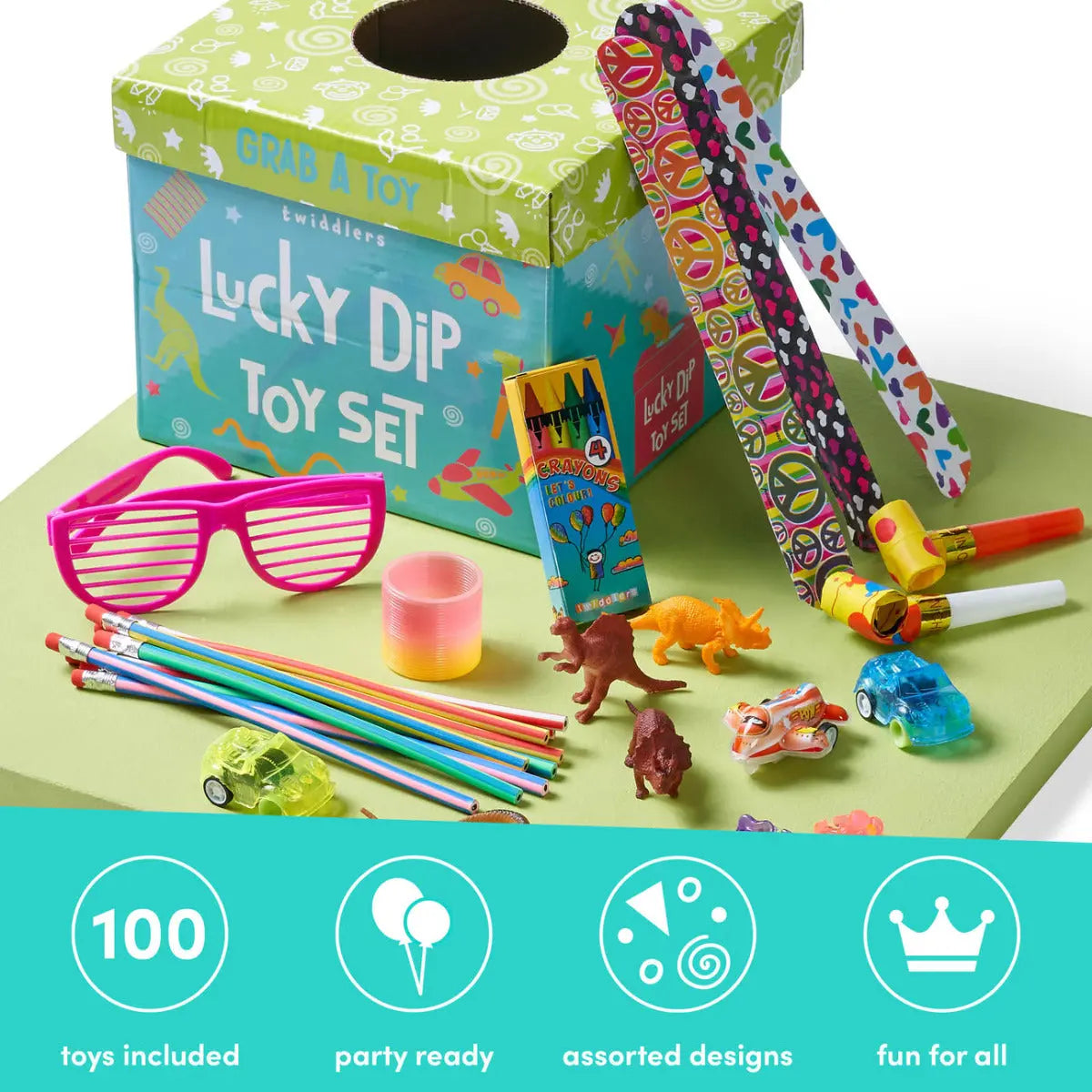 Unsere Mega Lucky Dip Box ist mehr als nur eine Sammlung – sie ist eine bunte Mischung aus verschiedenen Spielzeugen (100 Stück), die jede Überraschung zu einem Glückstreffer macht! Die Auswahl umfasst beliebte Klassiker wie Rückzieh-Flugzeuge und -Autos, Wachsmalstifte, Regenbogen-Slinkys, Spassbrillen, Mini-Schlangen, Plastikringe, Tröten, dehnbare Figuren, Kreisel, Mini-Dinosaurier, flexible Bleistifte, Schnapp-Armbänder und vieles mehr. Mit 13 verschiedenen, besonders beliebten Spielzeugen findet jedes Kind garantiert etwas, das es begeistert – für eine fröhliche und aufregende Atmosphäre voller Entdeckungen.