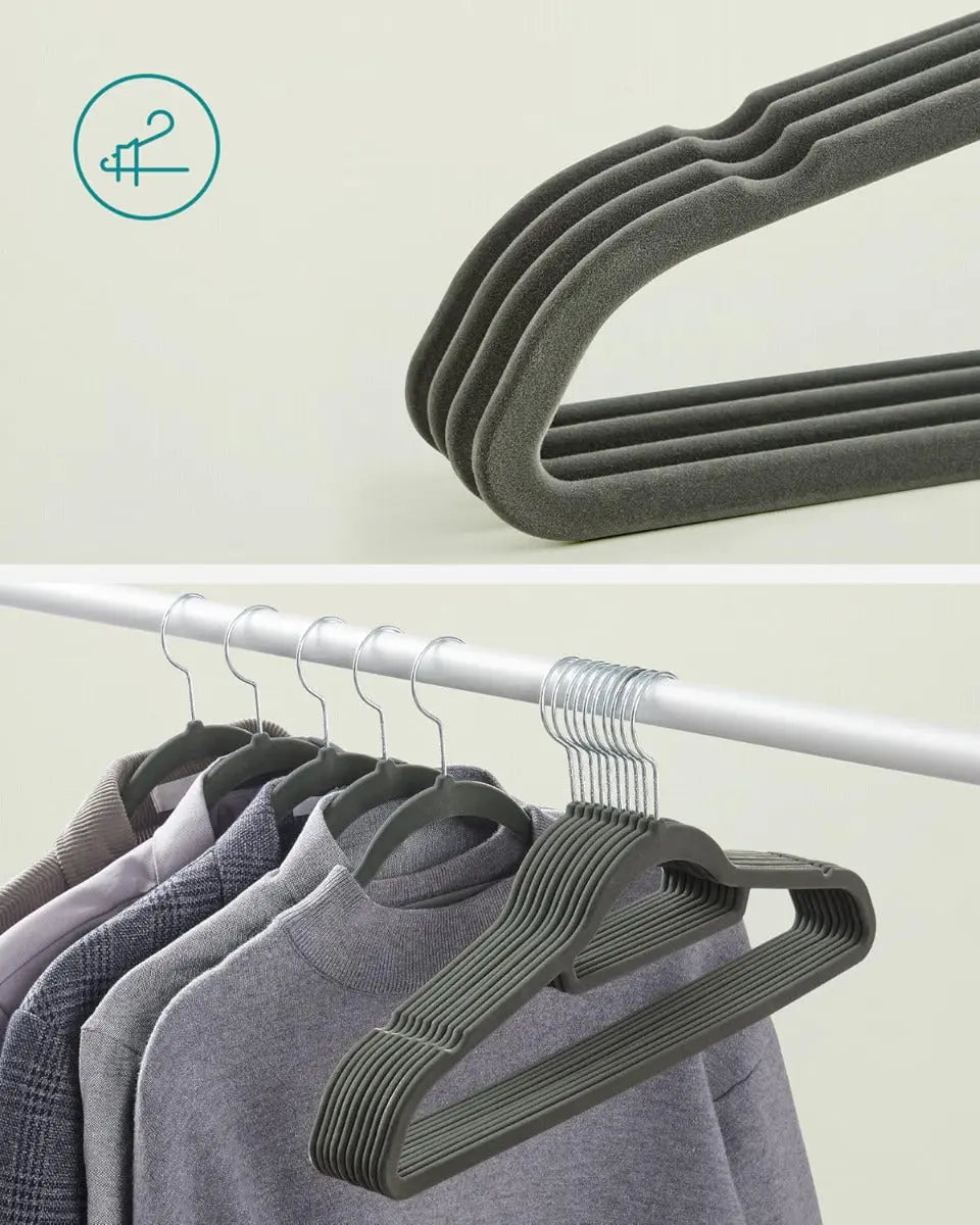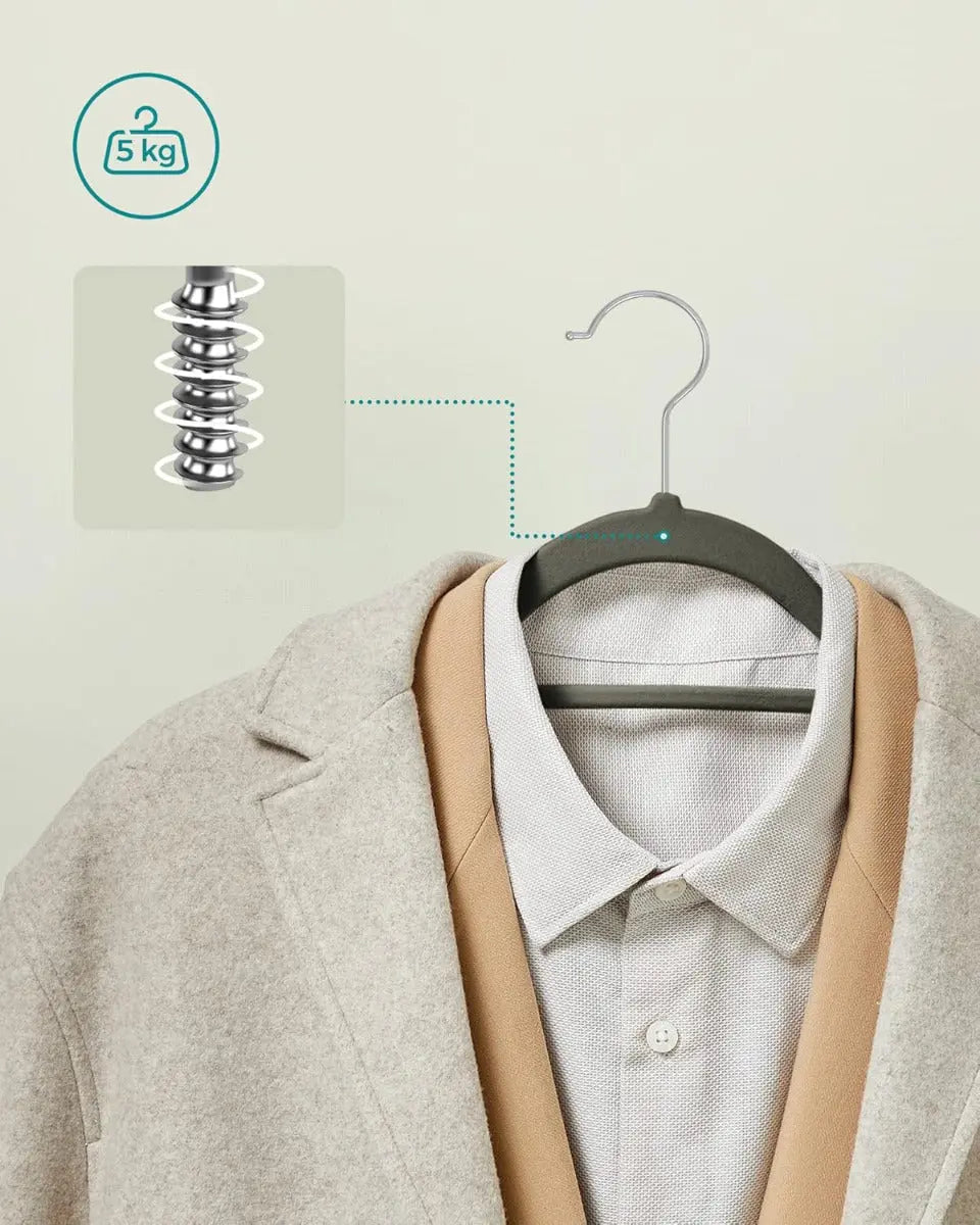 Die SONGMICS Samt-Kleiderbügel im praktischen Set vereinen elegantes Design mit cleverer Funktionalität. Ihre samtige Oberfläche sorgt für rutschfesten Halt – selbst bei feinen Stoffen – und schützt gleichzeitig die Form deiner Kleidung. Dank der geschwungenen Schulterpartien entstehen keine Druckstellen, während die U-förmige Aussparung das Aufhängen von Kleidungsstücken mit engem Kragen erleichtert.