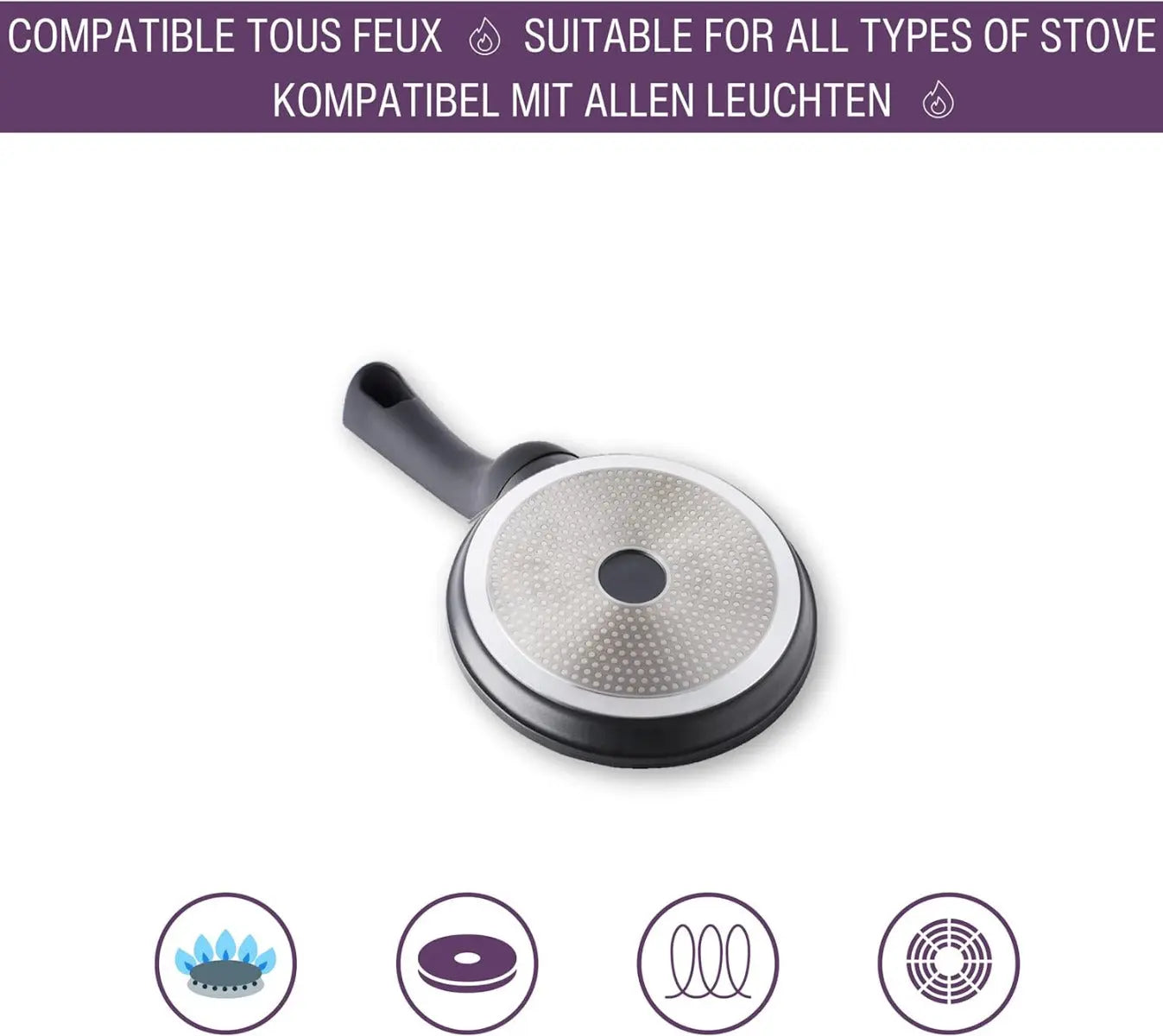 Gefertigt aus Aluminiumguss sorgt die Pfanne für eine gleichmässige Wärmeverteilung, sodass nichts anbrennt. Die Antihaft-Beschichtung ermöglicht fettarmes Braten und garantiert ein müheloses Herauslösen deiner Speisen.