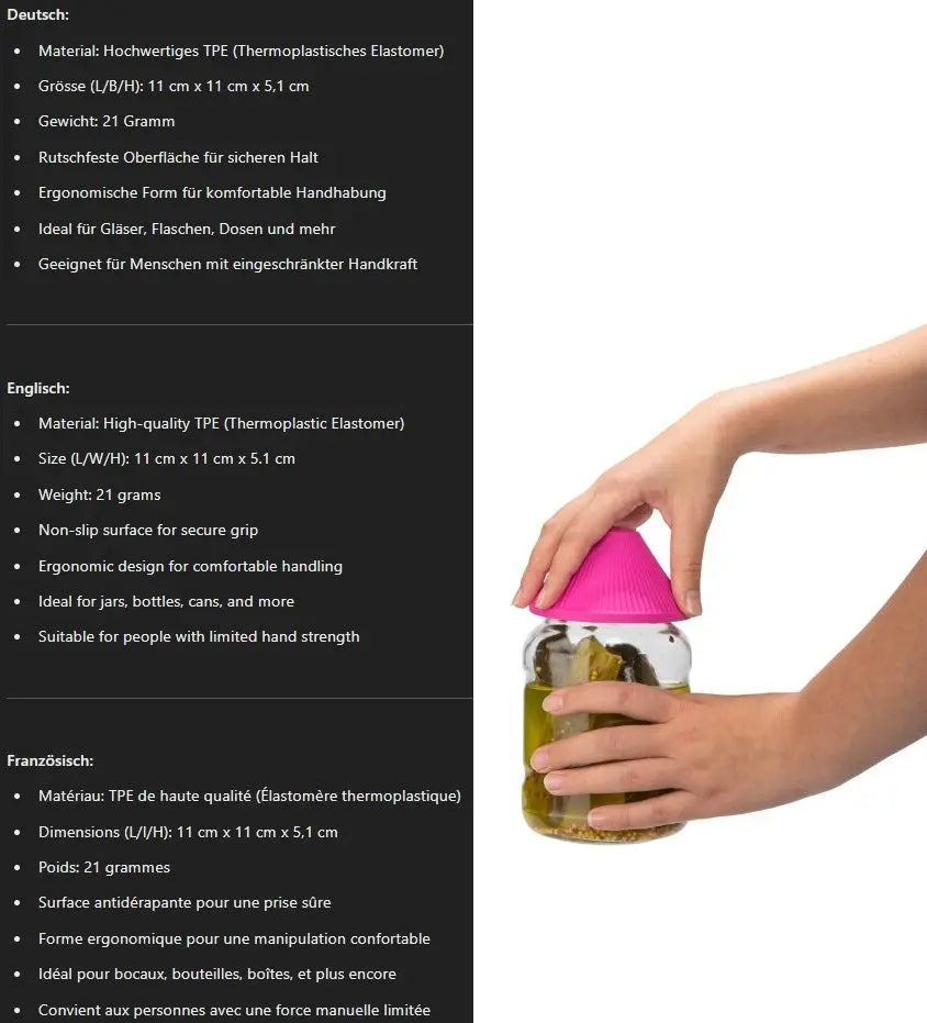Kunden schätzen besonders die Vielseitigkeit des Rapid Grippers, der mühelos Gläser, Flaschen und Dosen öffnet. Die rutschfeste Oberfläche und die ergonomische Form bieten maximalen Komfort, was ihn ideal für Menschen mit eingeschränkter Handkraft macht. Zudem begeistert das moderne Design und die kompakte Größe, die eine einfache Aufbewahrung ermöglichen. Mit nur 21 Gramm ist er leicht und perfekt für den Einsatz unterwegs.