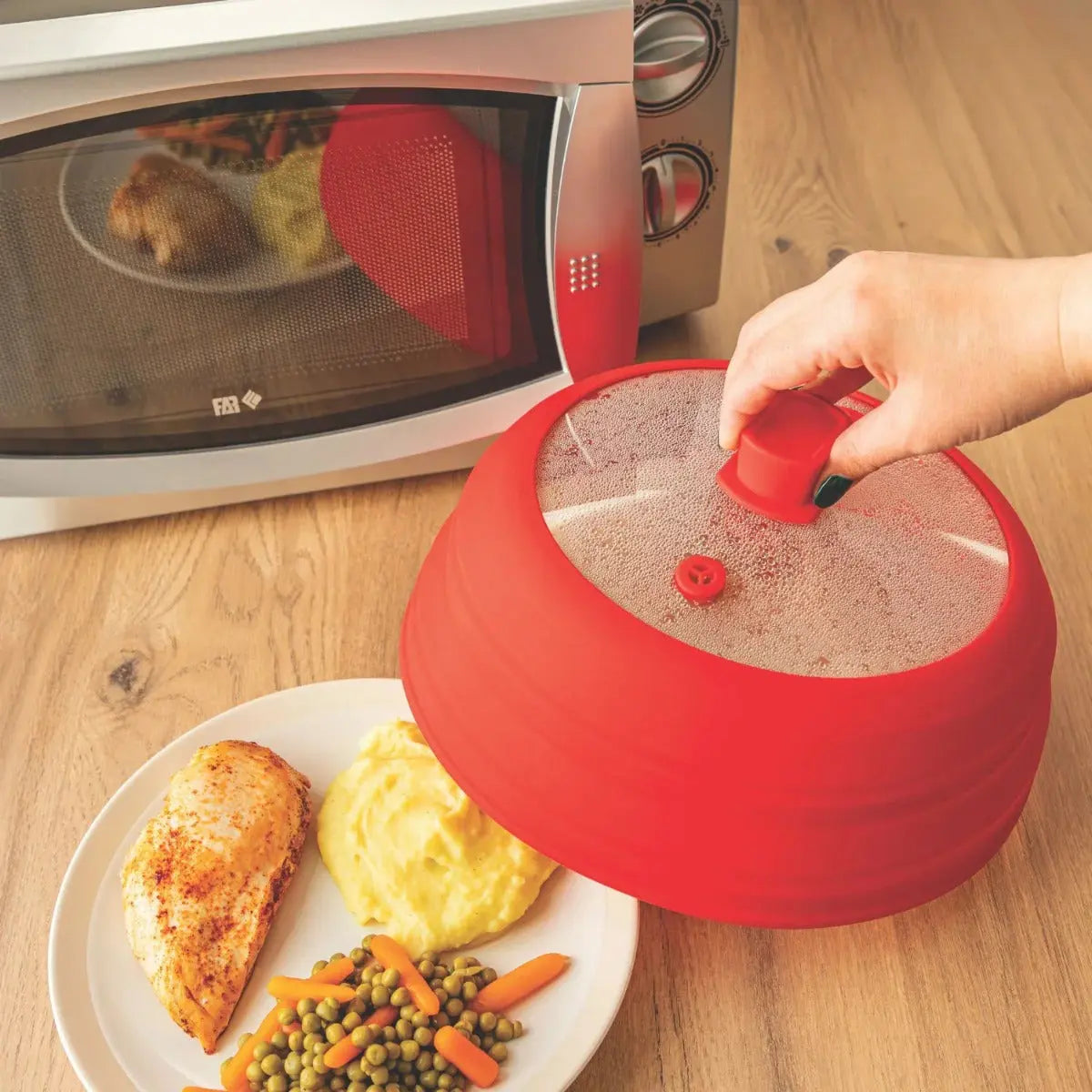 Der hitzebeständige Griff aus Silikon sorgt dafür, dass du den Deckel sofort nach der Mikrowelle sicher anheben kannst – ohne Wartezeit. Nach dem Gebrauch lässt sich die Haube flach zusammenfalten und kompakt verstauen.