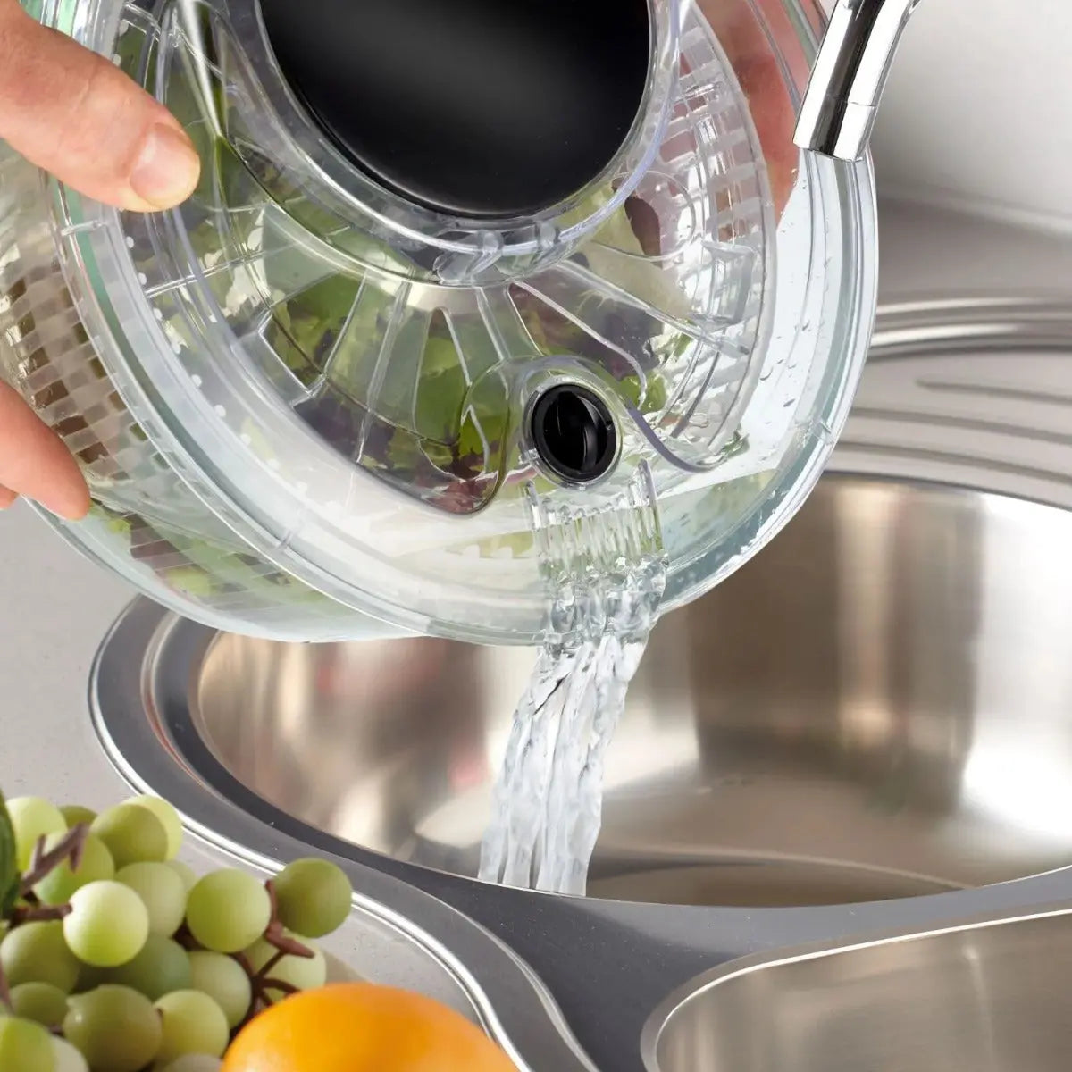 Die manuelle Rotation funktioniert leichtgängig in beide Richtungen, was für eine besonders effiziente Trocknung deiner Salate sorgt – ohne Strom, aber mit voller Kontrolle. Der Schleuderkorb besteht aus stabilem ABS-Kunststoff, während die Schüssel aus stoßfestem Borosilikatglas gefertigt ist – hygienisch, geschmacksneutral und langlebig.