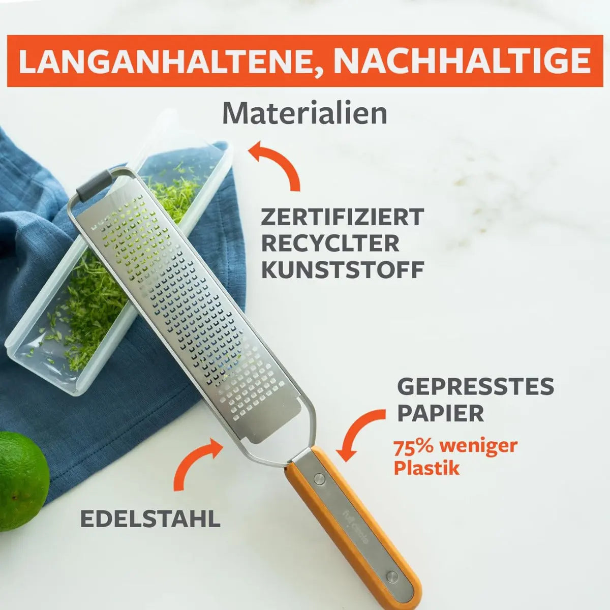 Vielseitige Reibefunktion für Zitrusfrüchte, Käse und Gewürze, Ergonomischer Griff aus Kraftpapier für sicheren Halt, BPA-freier Auffangbehälter für sauberes Arbeiten