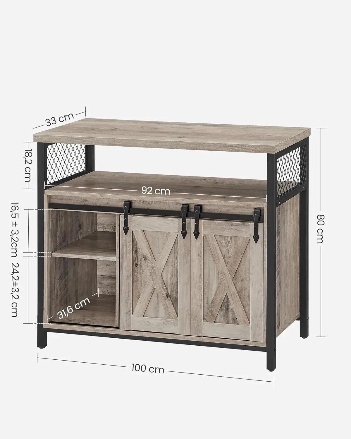 Das VASAGLE Sideboard LSC092B02 in elegantem Greige-Schwarz verbindet zeitlosen Landhausstil mit durchdachter Funktionalität und hochwertiger Verarbeitung: Mit den Massen 100 x 33 x 80 cm (L x B x H) bietet die stabile Tischplatte von 33 x 100 cm grosszügigen Platz für Dekoration, Küchenutensilien oder Elektronik, das Gesamtgewicht beträgt 24,7 kg. Zwei symmetrisch angeordnete Schiebetüren verleihen dem Küchenschrank eine elegante Optik und ermöglichen zugleich einfachen Zugriff auf den Innenraum, der durch sechs Fächer und drei dreifach höhenverstellbare sowie herausnehmbare Ablagen flexibel an verschiedene Aufbewahrungsbedürfnisse anpassbar ist.