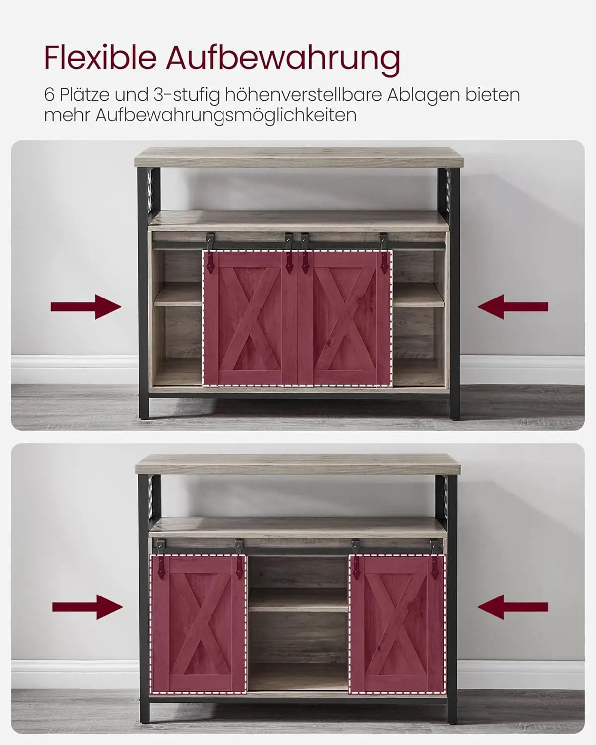Großzügiger Stauraum mit sechs Fächern und drei höhenverstellbaren Ablagen, Einfache Bedienung durch zwei Schiebetüren und belastbare Oberflächen bis 15 kg, Stabile Konstruktion mit Metallgestell, verstellbaren Füßen und Kippschutz