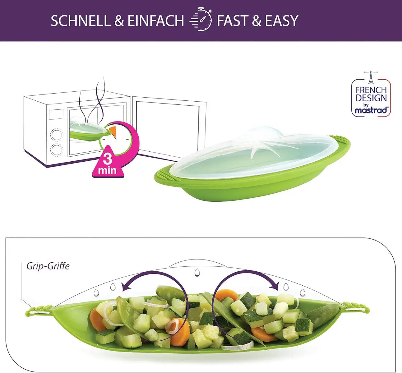 Die Dampfgarer sind mikrowellen- und ofenfest bis 220 °C und halten Temperaturen bis -40 °C aus – ideal auch zum Einfrieren von vorbereiteten Speisen. Nach dem Genuss lassen sie sich platzsparend verstauen und einfach mit dem Schwamm oder in der Spülmaschine reinigen.
