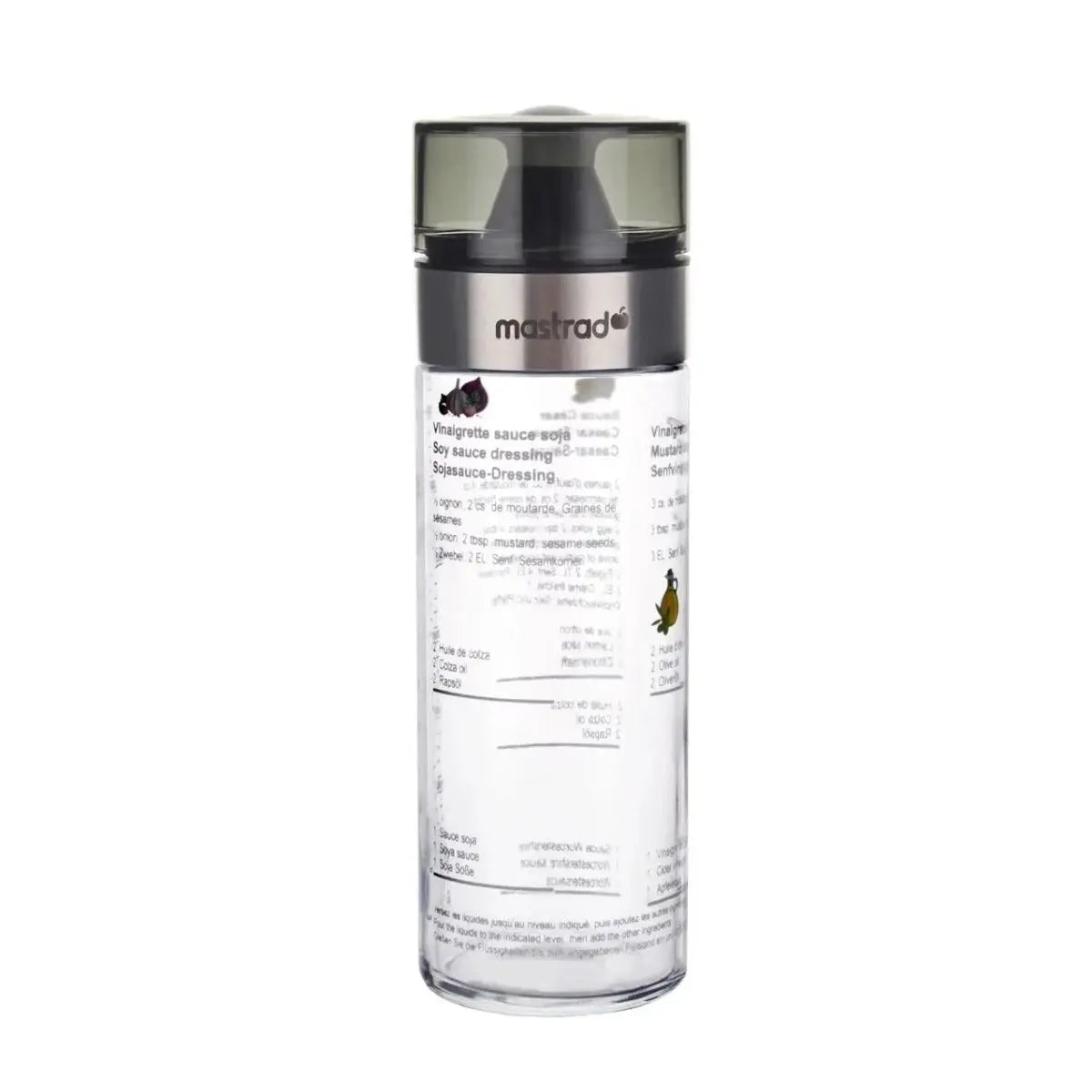 Besonders praktisch: Auf dem Shaker sind drei beliebte Rezepte (klassische Vinaigrette, Caesar-Dressing, Soja-Vinaigrette) direkt aufgedruckt – ideal als Inspiration und perfekte Orientierung. Eine kleine integrierte Misch-Helix sorgt dafür, dass sich Öl, Essig und Gewürze gleichmässig verbinden.