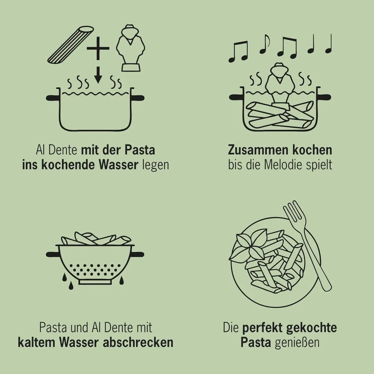 Spielender Pastatimer startet je nach Kochzeit die passende Melodie, Integrierter Temperatursensor für exakte Al-Dente-Ergebnisse, Hitzebeständig und wiederverwendbar – einfach mitkochen und abhören