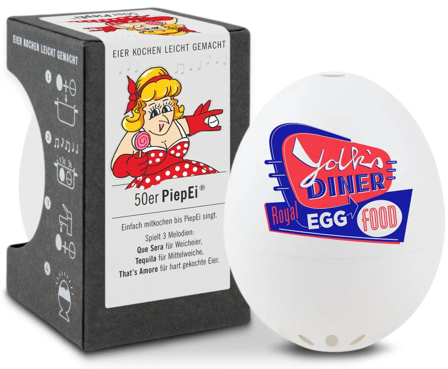 Zu weich, zu hart – aber nie auf den Punkt. Perfekt gekochte Eier sind eine Wissenschaft für sich. Für das PiepEi aber kein Problem. Einfach mit den Eiern lagern, zusammen mit den Eiern kochen und warten bis das PiepEi singt. Egal mit welcher Wassertemperatur man startet und egal auf welcher Höhe man kocht, das Ei wird perfekt.Ob weich, mittelweich oder hart gekocht, PiepEi spielt für jede Stufe eine andere Melodie. "QUE SERA" für weich gekochte Eier, "TEQUILA" für das perfekte mittelweiche Ei und "THAT'S AMORE" sobald das hart gekochte Ei fertig ist.