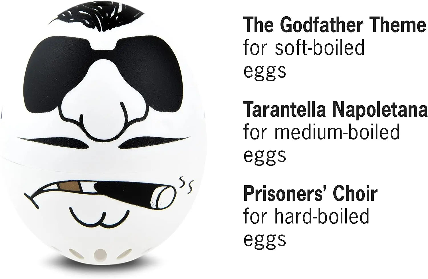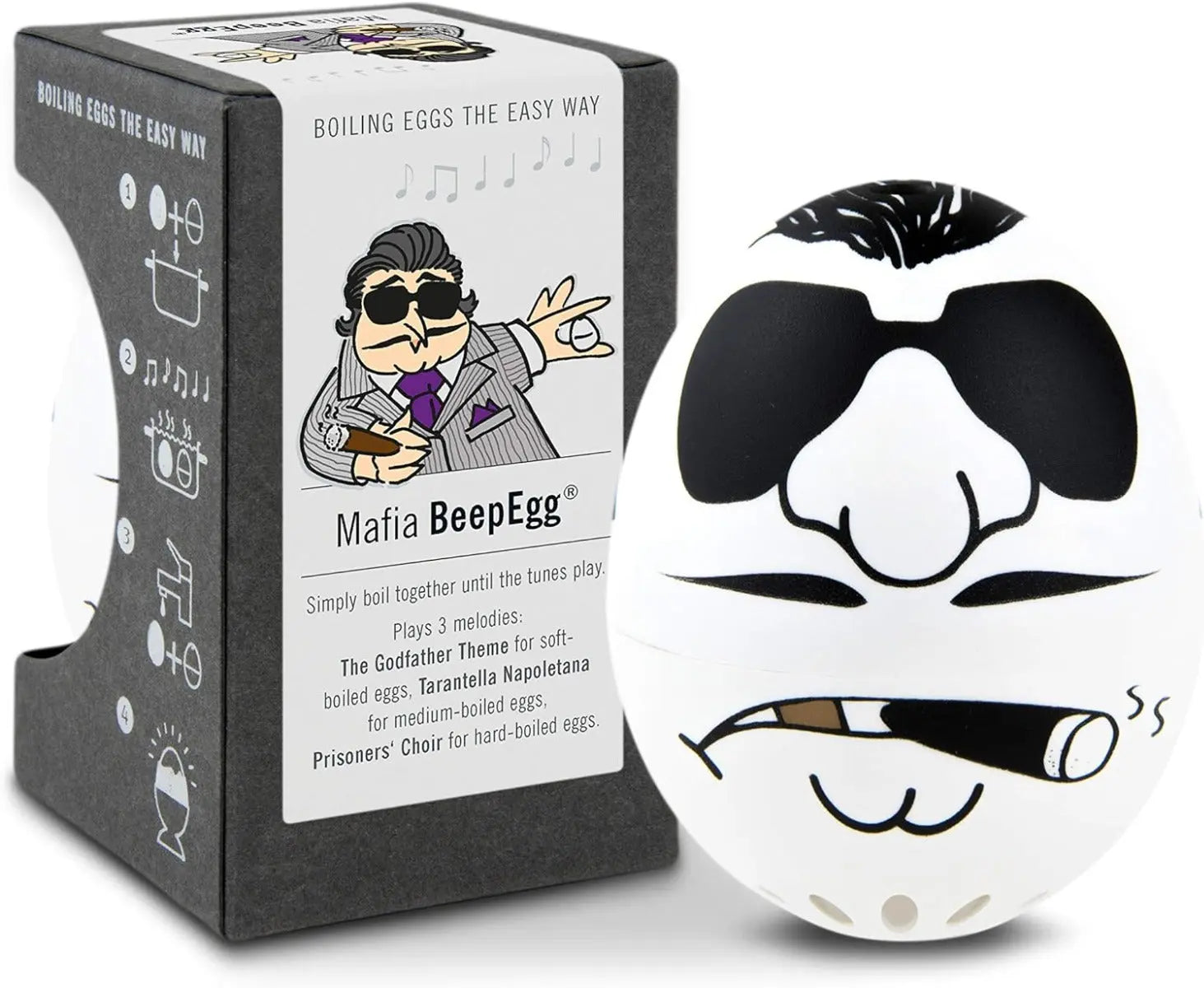 Drei Melodien für drei Härtegrade: Ob weich, mittelweich oder hart gekocht, Mafia PiepEi spielt für jede Stufe eine andere Melodie aus der Unterwelt. "TITELMELODIE: DER PATE" für weich gekochte Eier, "TARANTELLA NAOPOLENTANA" für das perfekte mittelweiche Ei und "GEFANGENENCHOR" sobald das hart gekochte Ei fertig ist.