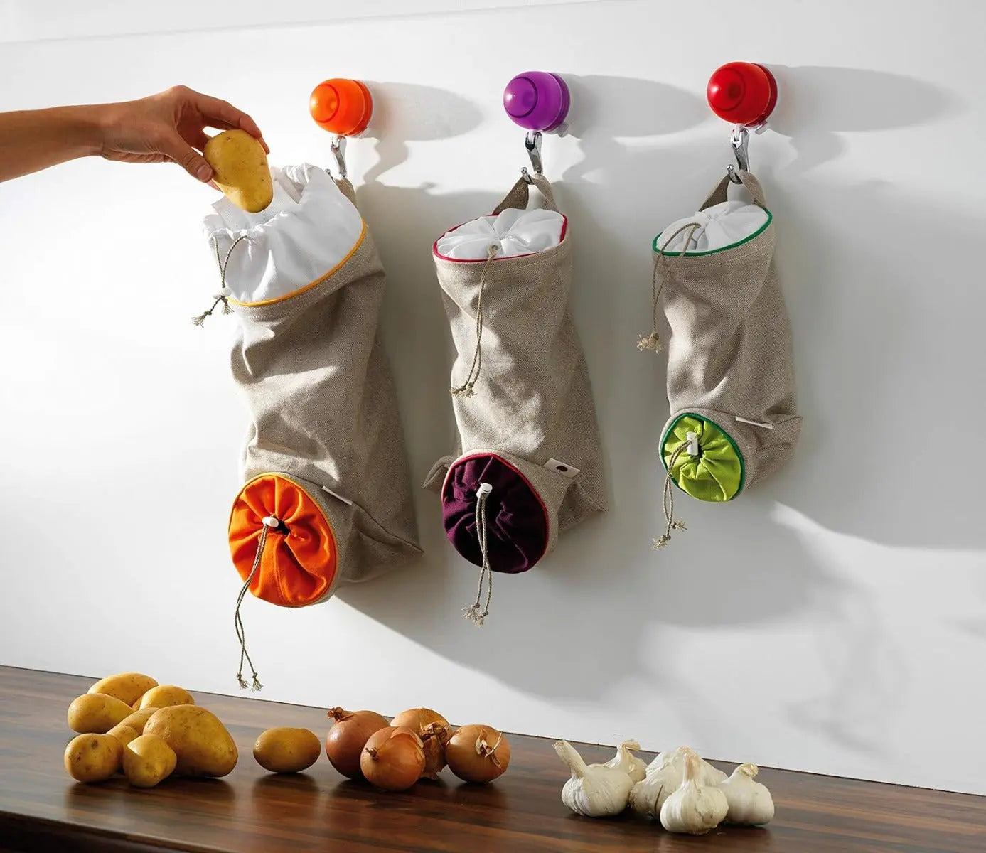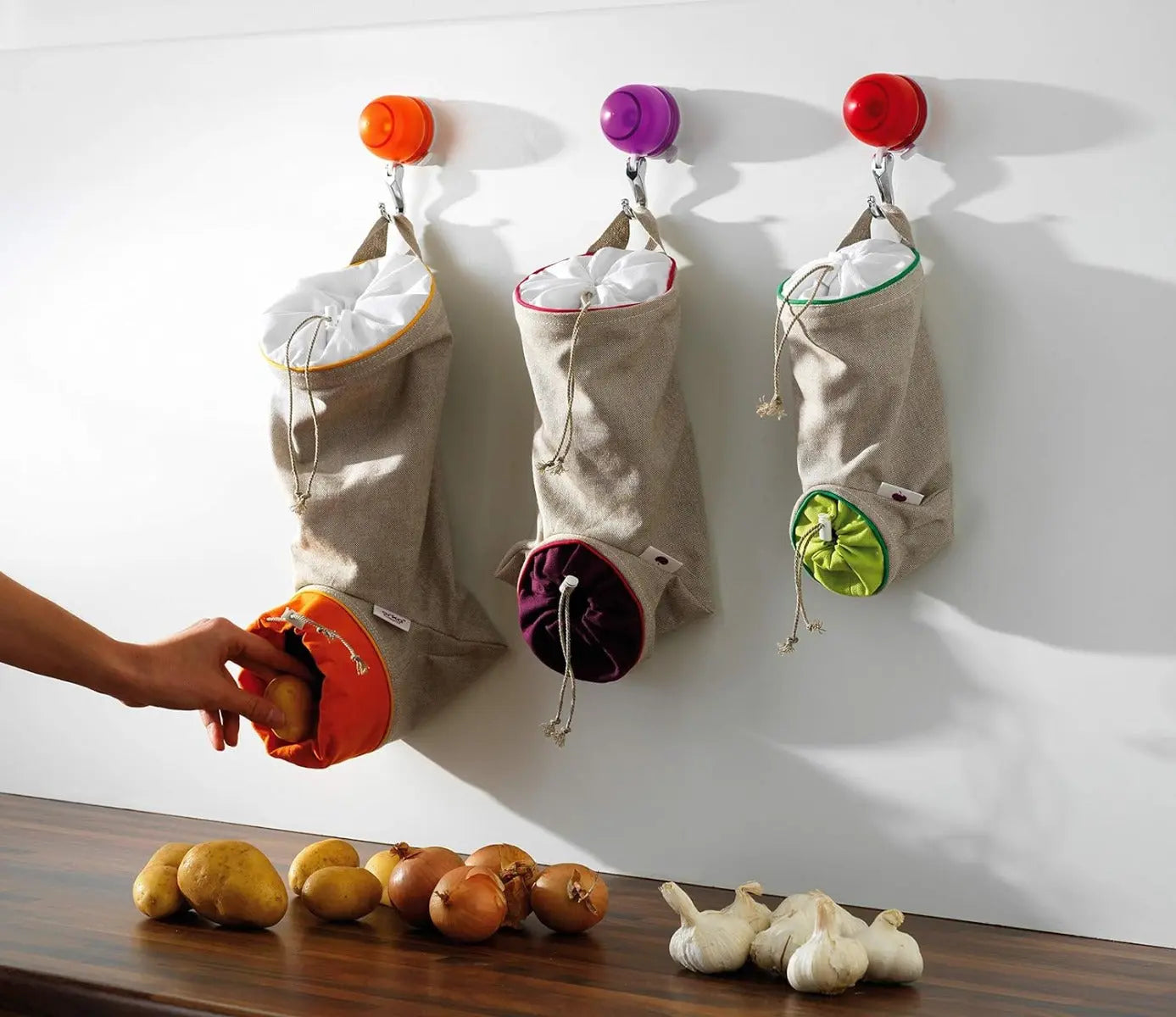 Durch seine zwei Öffnungen mit Zuziehbändern ermöglicht der Beutel eine einfache Handhabung: Das Gemüse kann oben eingefüllt und bei Bedarf unten entnommen werden, ohne dass der gesamte Inhalt herausgenommen werden muss. Diese praktische Funktion erleichtert den täglichen Gebrauch und unterstützt eine effiziente Küchenorganisation.
