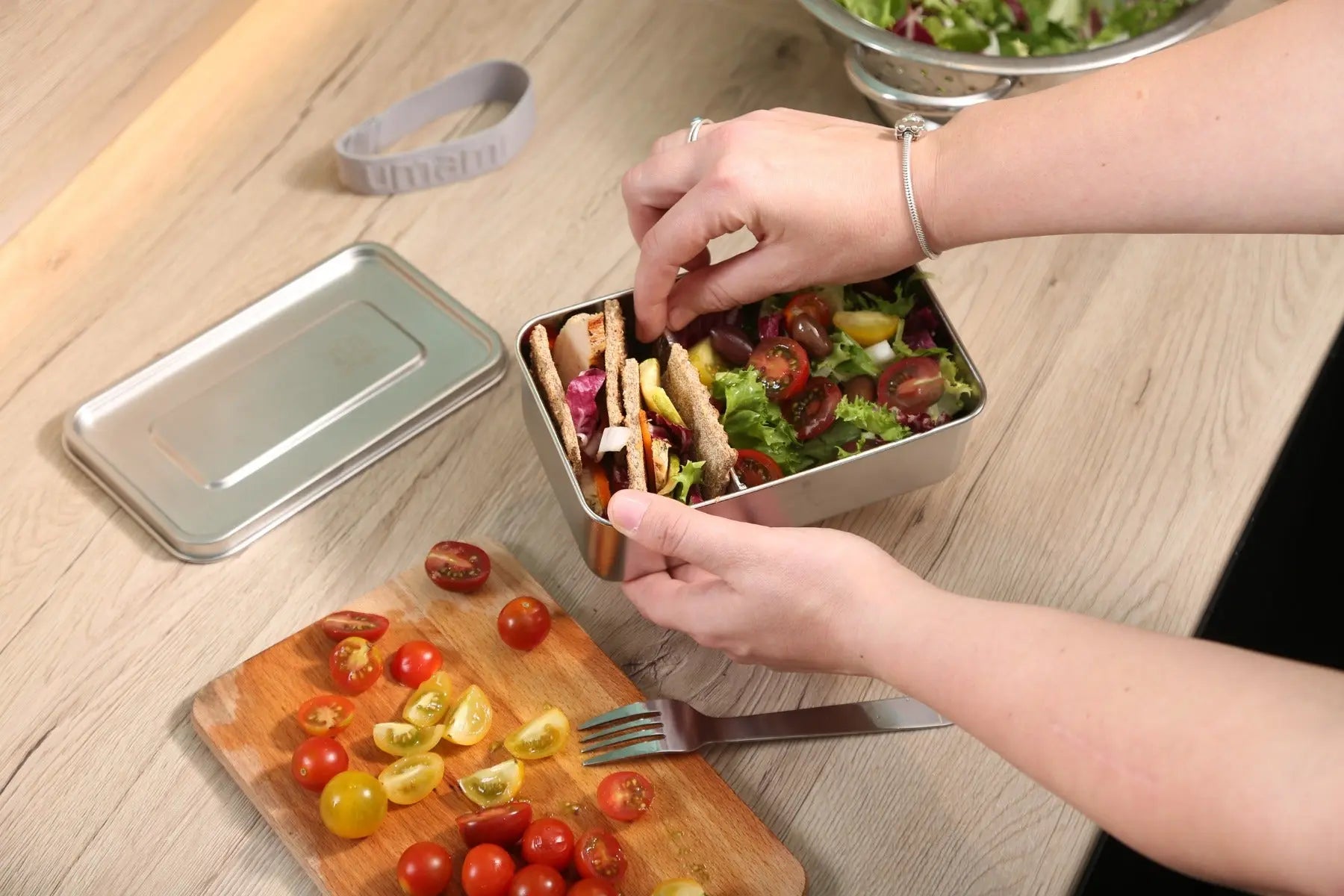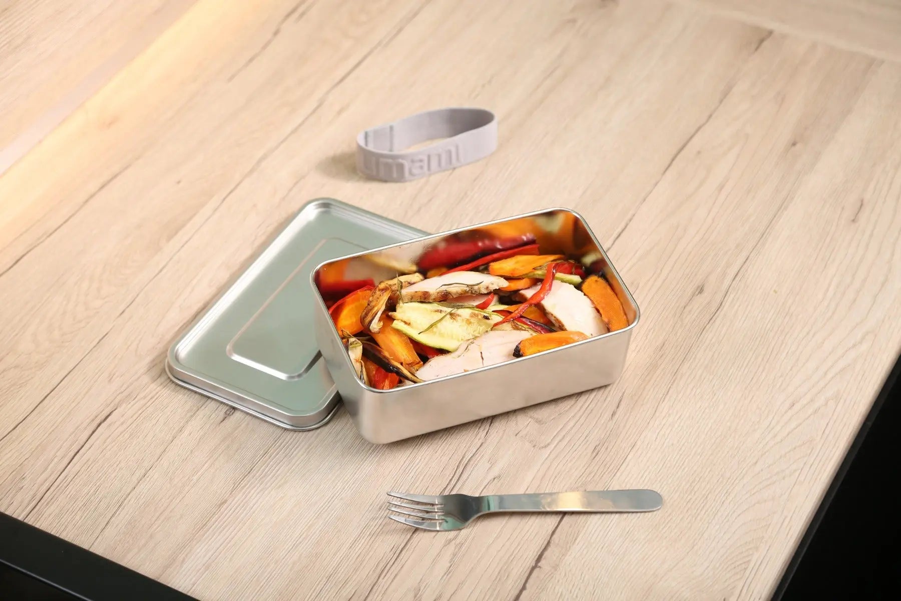 Tragbar und Stilvoll: Das schlanke, moderne Design der Stainless Steel Bento Box von Umami macht sie zu einem eleganten Begleiter für Büro, Schule oder Ausflüge.