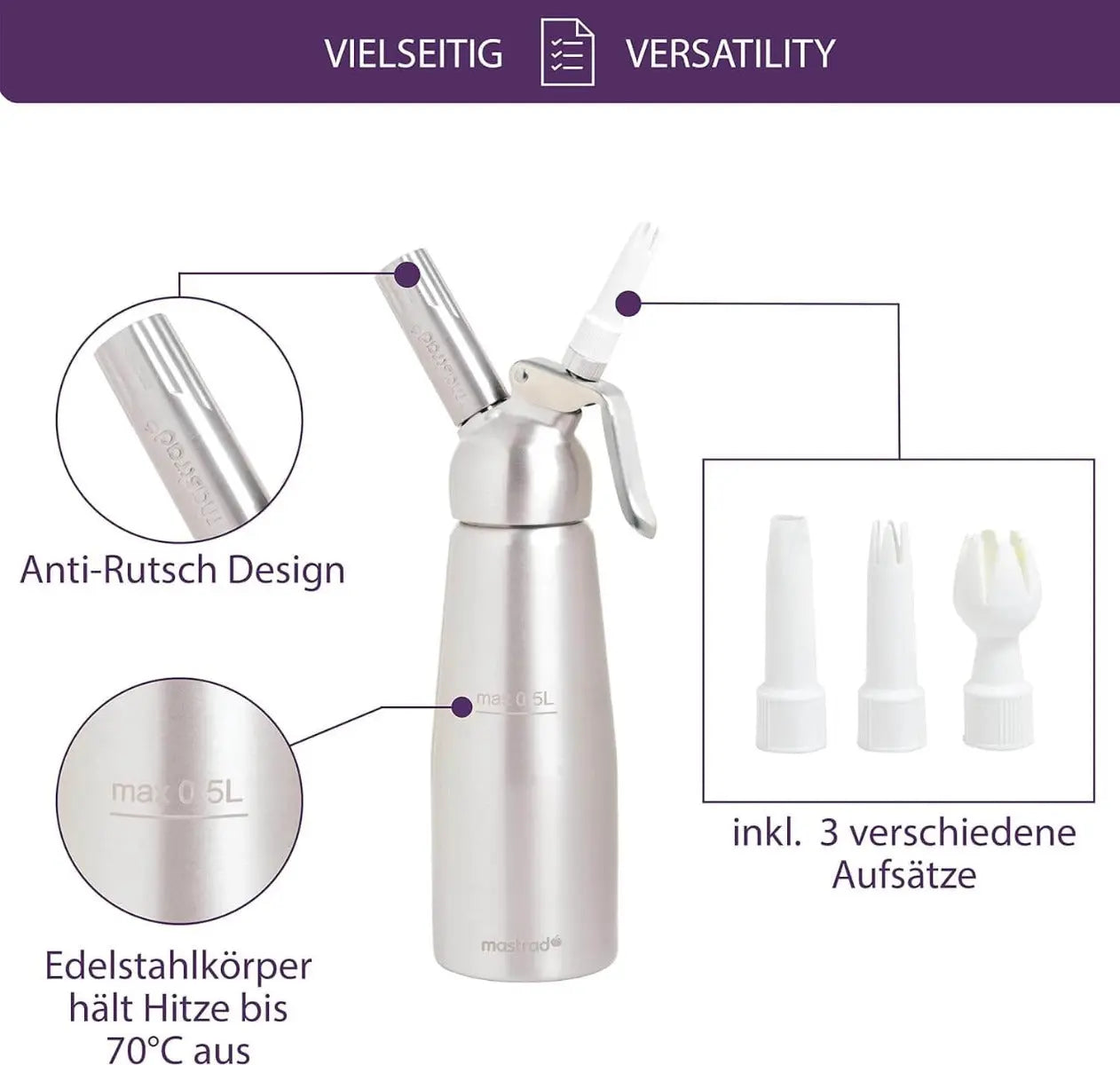 Zur weiteren Ausstattung gehören drei verschiedene Düsen, die eine Vielzahl von Texturen und Mustern für Ihre Schaumkreationen ermöglichen. Egal, ob Sie feine Desserts, kreative Vorspeisen oder innovative Hauptgerichte zubereiten möchten, dieser Siphon gibt Ihnen die Flexibilität, Ihre kulinarischen Visionen in die Tat umzusetzen. Eine Reinigungsbürste ist ebenfalls enthalten, um die Reinigung nach der Verwendung zu vereinfachen.