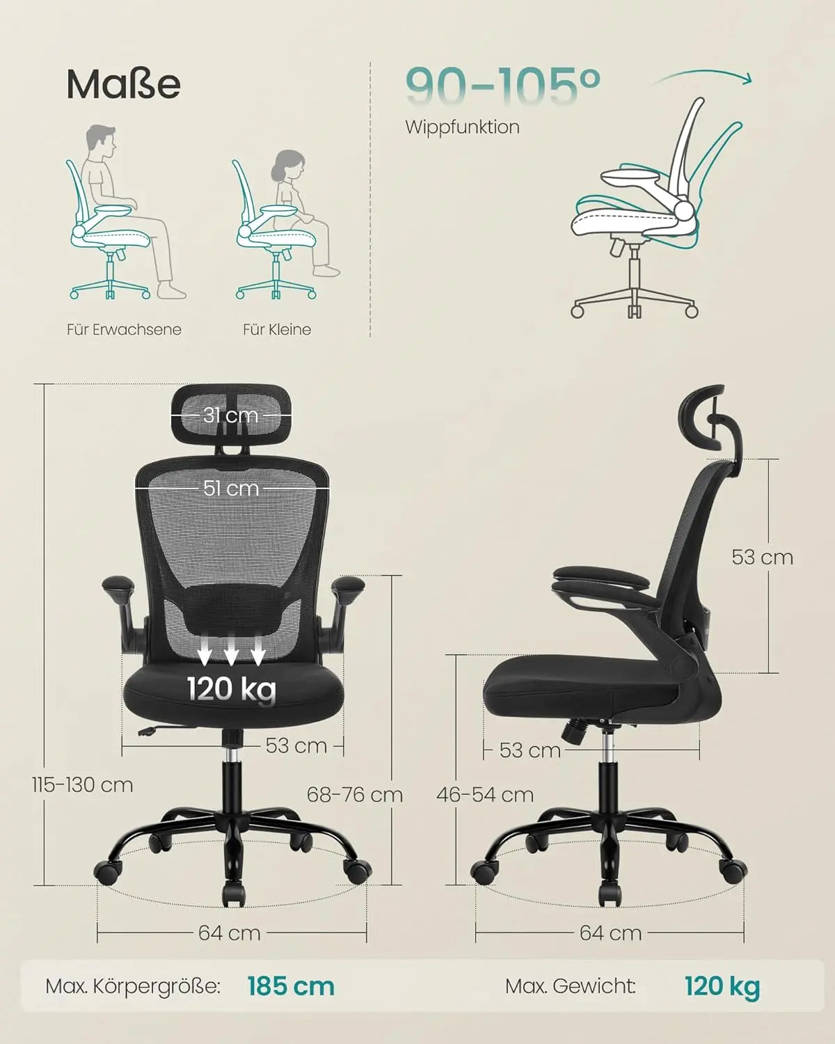 Ergonomische S‑förmige Rückenlehne mit höhenverstellbarer Lenden- und Kopfstütze, Verstellbare Sitzhöhe 46–54 cm mit Wippfunktion 90–105°, Klappbare Armlehnen und atmungsaktives Netz für langanhaltenden Komfort