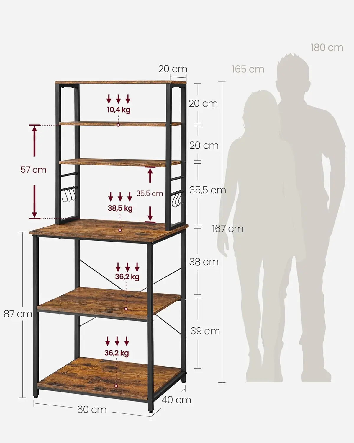 Dank der soliden Konstruktion aus robustem Stahlrahmen und langlebigen Spanplatten ist dieses Regal nicht nur stark, sondern auch äusserst stabil. Es trägt mühelos Ihre Mikrowelle, Kaffeemaschine und weitere Küchengeräte. Mit kompakten Massen von 40 x 60 x 167 cm ist es ideal für kleine Küchen und nutzt den verfügbaren Platz optimal aus.