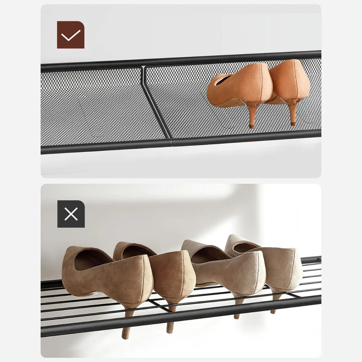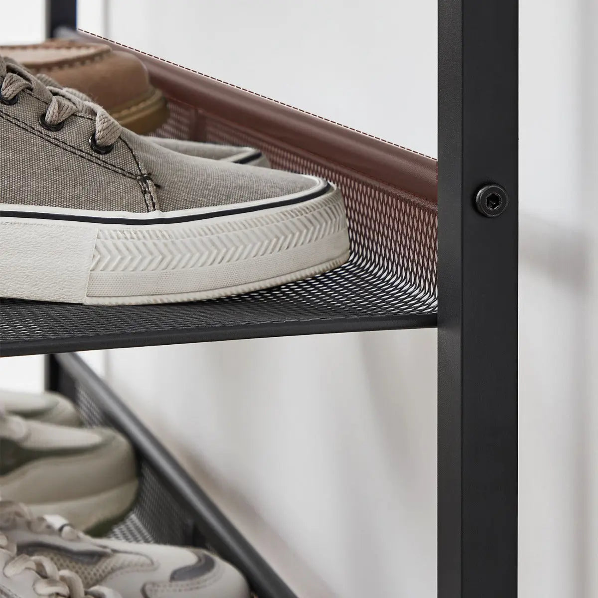 Die Oberplatte trägt bis zu 27 kg – perfekt für Taschen, Deko oder Aufbewahrungsboxen. Jede der Gitterebenen ist mit bis zu 11 kg belastbar und bietet zuverlässigen Halt für Ihre Schuhsammlung. Für zusätzliche Sicherheit ist ein Kippschutz im Lieferumfang enthalten.
