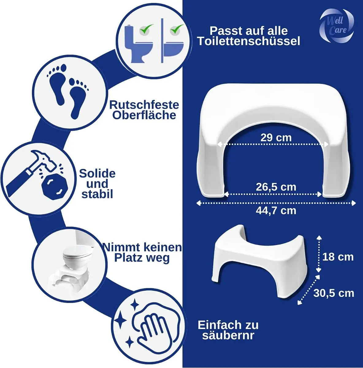 Physiologisch optimale Körperhaltung für natürliche Erleichterung, Antirutschoberfläche für sicheren Stand, Kompatibel mit allen Standardtoiletten.