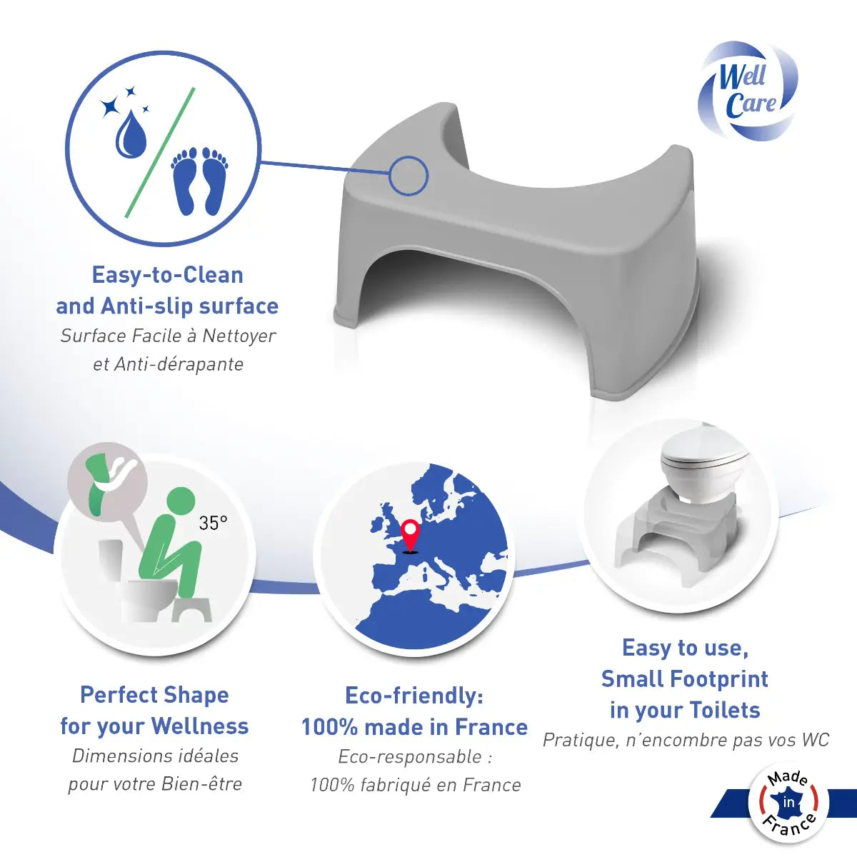 Ideal für Ihr Wohlbefinden: Mit einer Höhe von 18 cm ist dieser Toilettenhocker so konzipiert, dass Sie Ihre Füsse auf der Toilette mühelos und weit genug anheben und so die von Medizinern empfohlene Körperhaltung einnehmen können; diese trägt zur natürlichen Erleichterung bei vielen gesundheitlichen Problemen (Verstopfung, Hämorrhoiden, schwacher Beckenboden usw.) bei und ermöglicht eine vollständigere Entleerung, wodurch sich Ihr Bauch angenehm flach anfühlt Umweltschonend: Da direkt und komplett in Frankreich aus recyceltem Kunststoffmaterial produziert und da die Versandverpackung ausschliesslich aus recycelbarem Karton besteht. Einzigartiges und praktisches Design: Wodurch sich der Toilettenhocker harmonisch an Ihr WC anfügt; der Hocker lässt sich bei Nichtgebrauch unauffällig unter der Toilette verstauen, braucht wenig Platz und ist nicht störend, wenn man im Stehen pinkelt. Langlebiges und leicht zu reinigendes Material: Dank der porenfreien, das Bakterienwachstum hemmenden Oberfläche; für gängige Reinigungsprodukte geeignet. Sehr stabil und robust: Denn es steht das industrielle Know-how eines französischen Kunststoffexperten dahinter. Antirutschoberfläche: Die verhindert, dass Ihre Füße abrutschen. Geeignet für Ihre ganze Familie: Der Hocker kann sowohl von Erwachsenen als auch von Kindern (wenn sie alt genug sind, um alleine auf die Toilette zu gehen) verwendet werden, denn die Standardmasse sind für die meisten Modelle geeignet. Universal: Der Hocker ist kompatibel mit allen Arten von Standardtoiletten, einschließlich hängenden Toiletten.