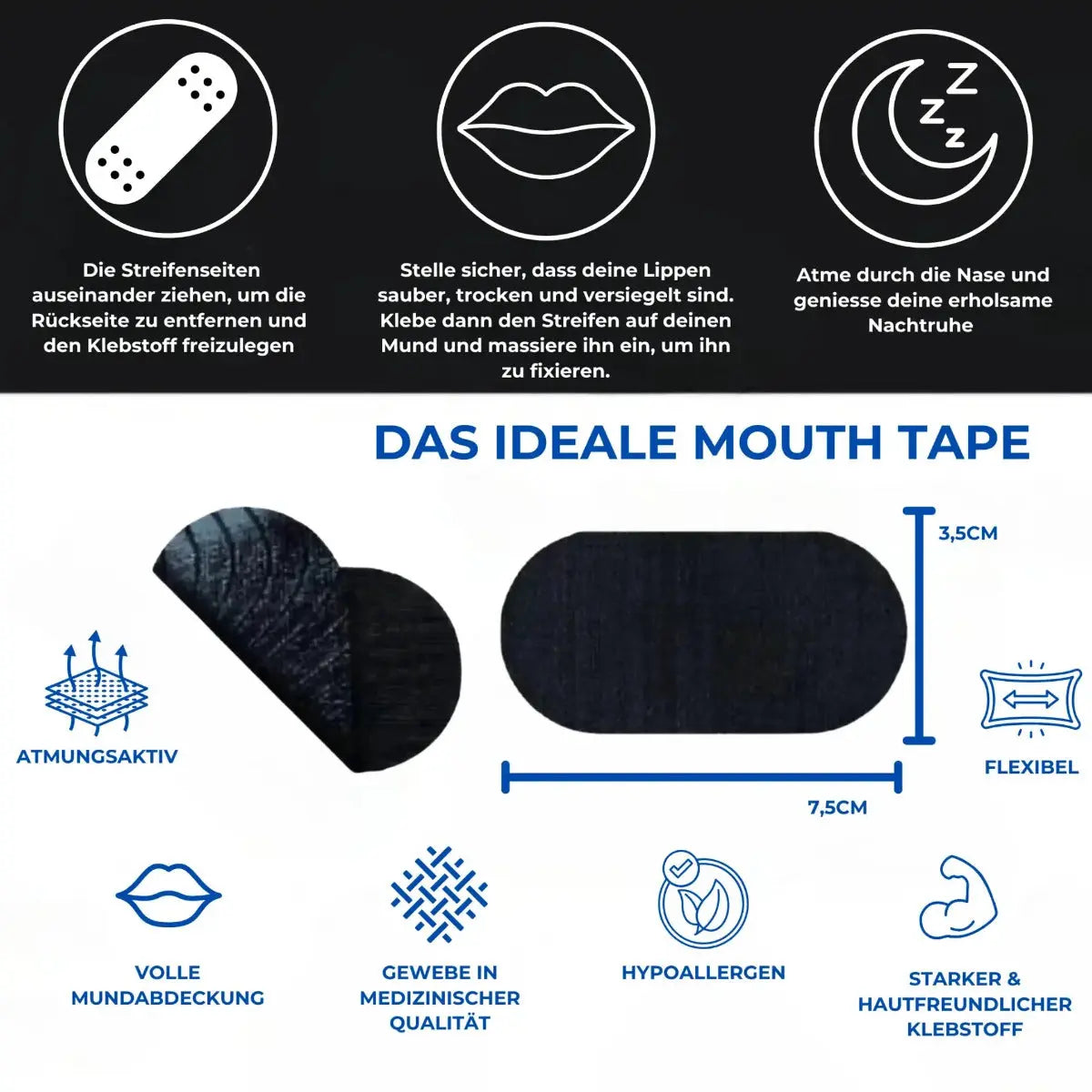 Die Anwendung ist unkompliziert: Zuerst werden Gesicht und Lippen gereinigt und gründlich getrocknet. Anschliessend wird der Mund geschlossen und das Pflaster mittig über die Lippen geklebt. Danach wird es sanft angedrückt und leicht massiert, um einen sicheren Halt zu gewährleisten. Vor dem Einschlafen sollte überprüft werden, ob die Nasenatmung frei und angenehm ist. Am Morgen lässt sich das Pflaster einfach und schmerzfrei entfernen – für eine erholsame Nacht ohne Schnarchen und Mundtrockenheit.