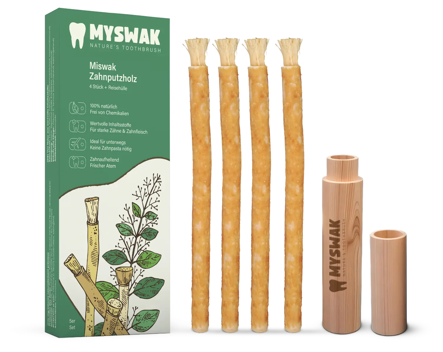 Seit Jahrhunderten vertrauen Menschen auf Miswak. Mit MYSWAK verbindest du Tradition mit moderner Zahnpflege. Miswak ist ein 100 % natürliches Zahnreinigungsinstrument, das seit Jahrhunderten für die tägliche Zahnpflege geschätzt wird. Es ist biologisch abbaubar und nachhaltig – ideal für unterwegs und einfach zu benutzen. Miswak ermöglicht eine sanfte Reinigung ganz ohne Zahnpasta – natürlich und unkompliziert.