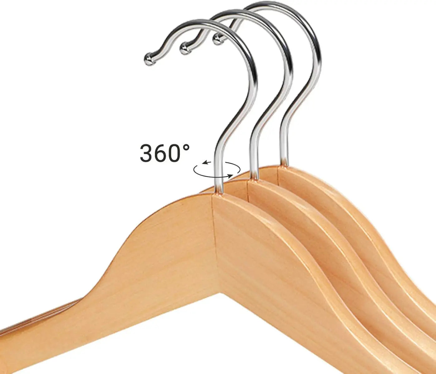 Dank der verbreiterten Schulterpartien behalten auch empfindliche Stoffe ihre Form – ohne Falten oder Abdrücke. Der stabile Hosensteg mit rutschfester Ummantelung sorgt dafür, dass auch Hosen, Schals oder Röcke sicher hängen bleiben. Besonders praktisch ist der 360° drehbare Haken aus verchromtem Metall: So kannst du die Bügel flexibel und platzsparend einsetzen, unabhängig davon, wie dein Kleiderschrank aufgebaut ist.
