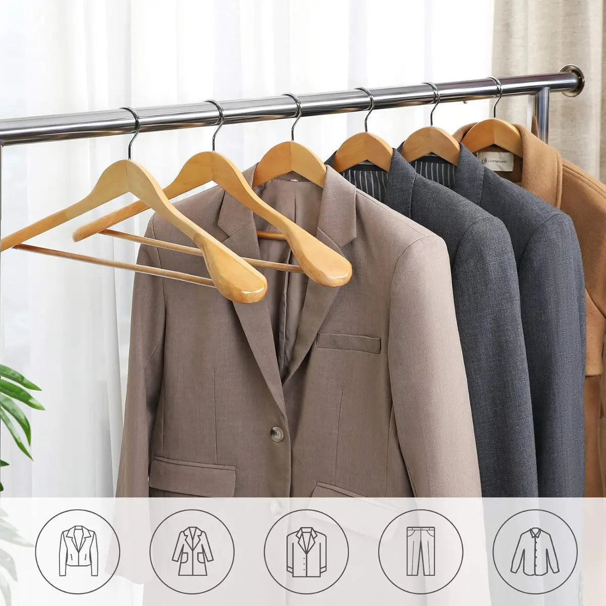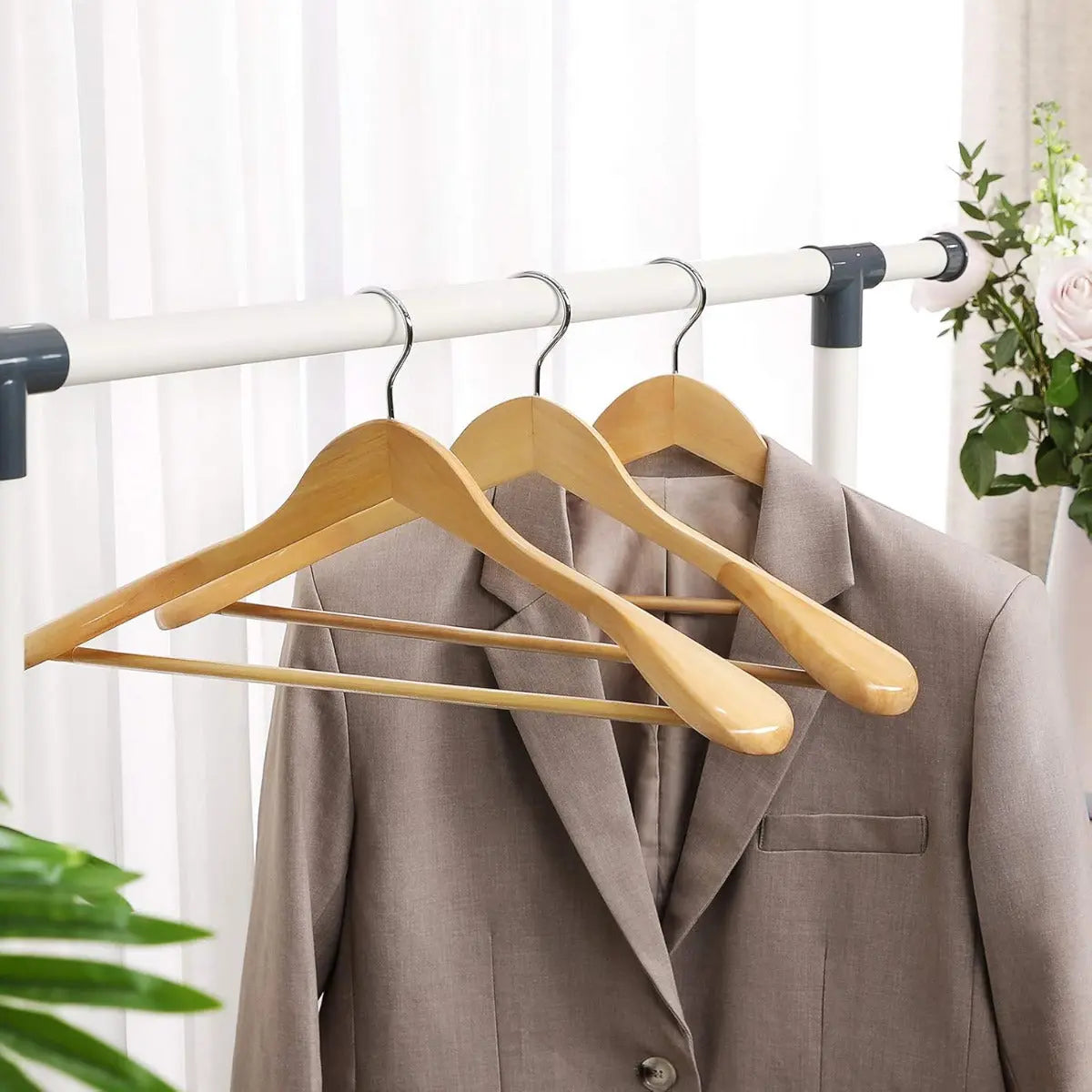 Massiv, edel, durchdacht: Die SONGMICS Anzugbügel aus naturfarbenem Holz bieten optimalen Halt für schwere Kleidung. Mit breiten Schultern, rutschfestem Hosensteg und drehbarem Haken sind sie ideal für Anzüge, Jacken oder Hemden. Perfekt für Ordnung mit Stil.