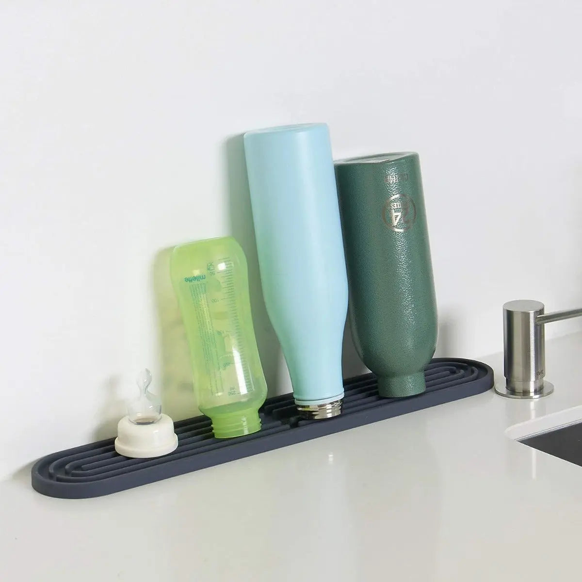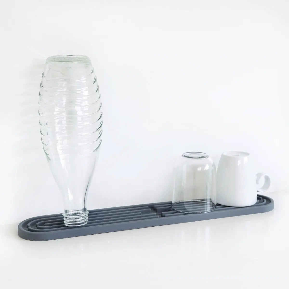 Die platzsparende Abtropfmatte und Barmatte. Spülmaschinenfestes und antibakterielles Abtropfgestell für Karaffen, Flaschen, Babyfläschchen, Weingläser, Schneidbretter, Kochlöffel oder andere Utensilien der Küche. Dri.pad ist eine Küchenmatte aus hochwertigem Platin-Silikon. Weich und sanft zu Ihren Gläsern und der Arbeitsplatte. Antibakteriell, und hitzebeständig bis 220 Grad C. In den Massen angelehnt an die klassische Barmatte: 43 cm x 7.8 cm. Dri.pad ist z.B. auch ein Abtropfhalter passend für Sodastream, Emil, Crystal oder andere Flaschen.