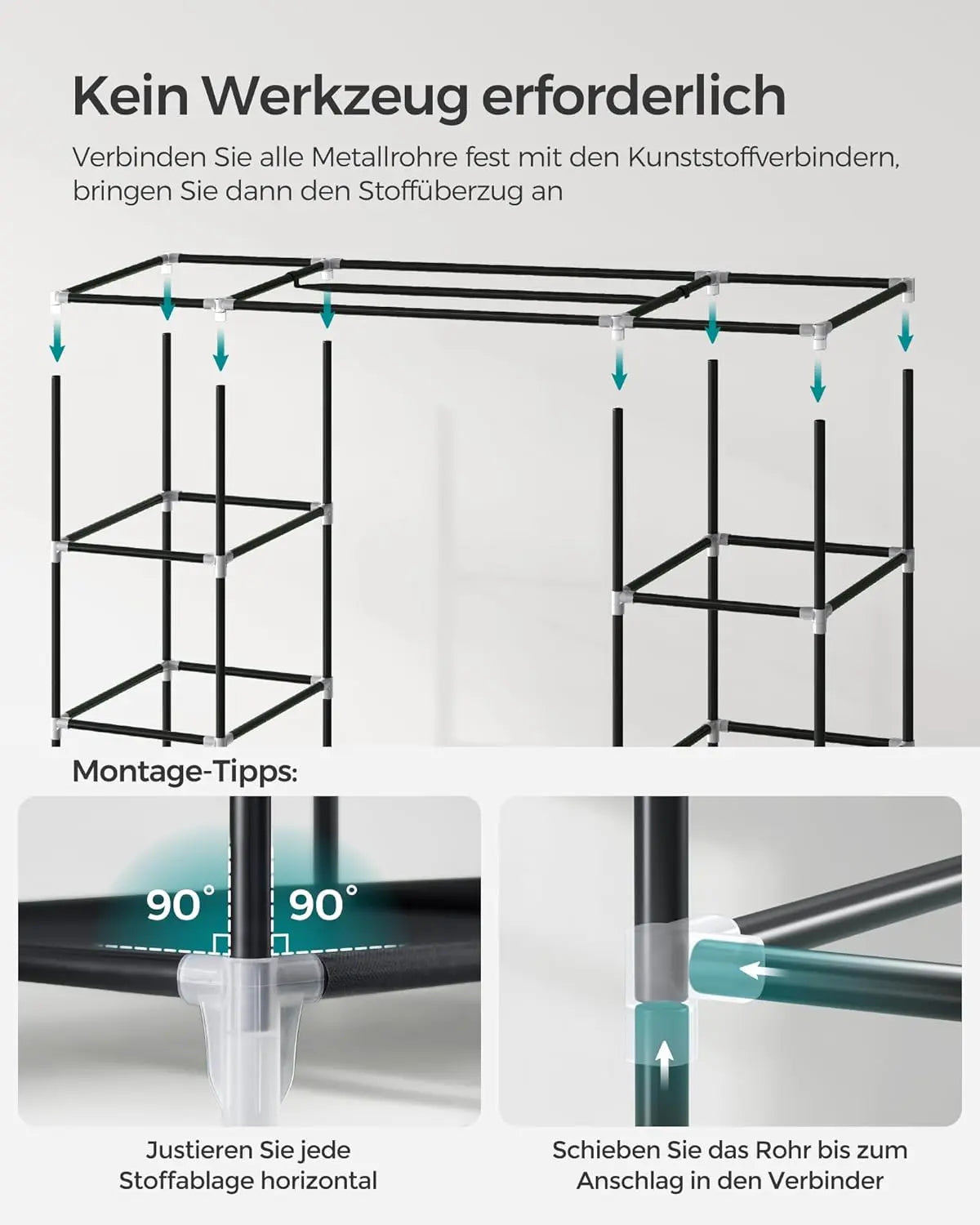 Die Montage? Ein Kinderspiel! Sie müssen keine Stunden mit komplizierten Anleitungen verbringen. Einfach die Rohre in die Kunststoffverbindungsstücke stecken, und schon ist Ihr neuer Kleiderschrank einsatzbereit.