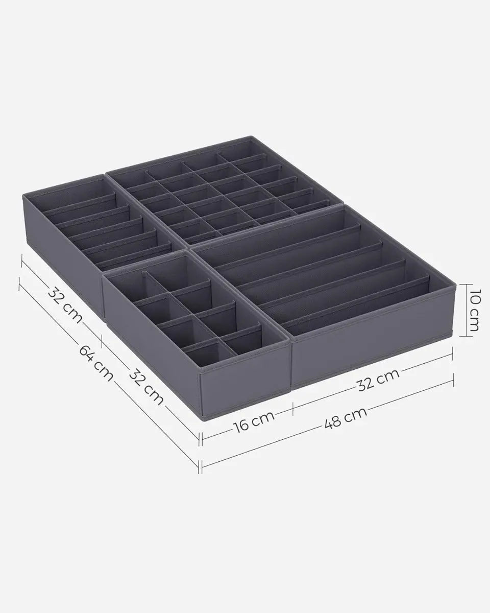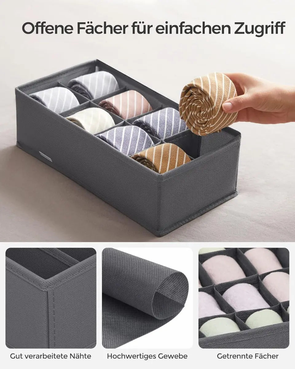 Mit insgesamt 8 Boxen in vier Grössen (u. a. 5er, 6er, 8er und 24er-Fächer) passt das Set flexibel in Kommoden, Regale oder Schrankfächer. Perfekt für alle, die Wert auf Ordnung, Übersicht und ein ruhiges Erscheinungsbild im Kleiderschrank legen. SONGMICS kombiniert hier clevere Funktionalität mit schlichtem, stilvollem Design.