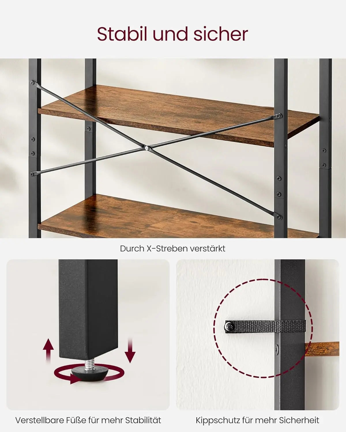 Für zusätzliche Stabilität sorgt das durchdachte Design mit X-förmigen Stangen und verstellbaren Füssen, die das Regal auch auf leicht unebenen Böden ins Gleichgewicht bringen. Der integrierte Kippschutz ermöglicht eine sichere Wandmontage und gibt Ihnen die Gewissheit, dass alles an seinem Platz bleibt.