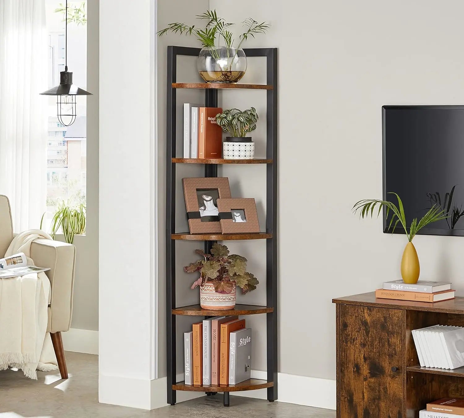 Kunden begeistert vor allem das platzsparende Eckdesign und das moderne Industrie-Aussehen. Besonders beliebt sind die fünf stabilen Ablagen, die robuste Stahlkonstruktion, die einfache Montage mit nummerierten Teilen und Werkzeug sowie die mitgelieferten Anti-Kipp-Kits. Das Regal vereint Optik und Funktionalität und eignet sich ideal zum stilvollen Präsentieren von Büchern und Deko.