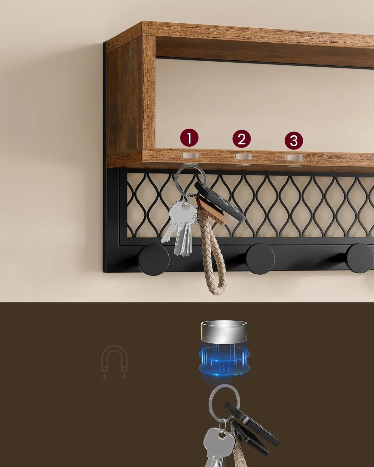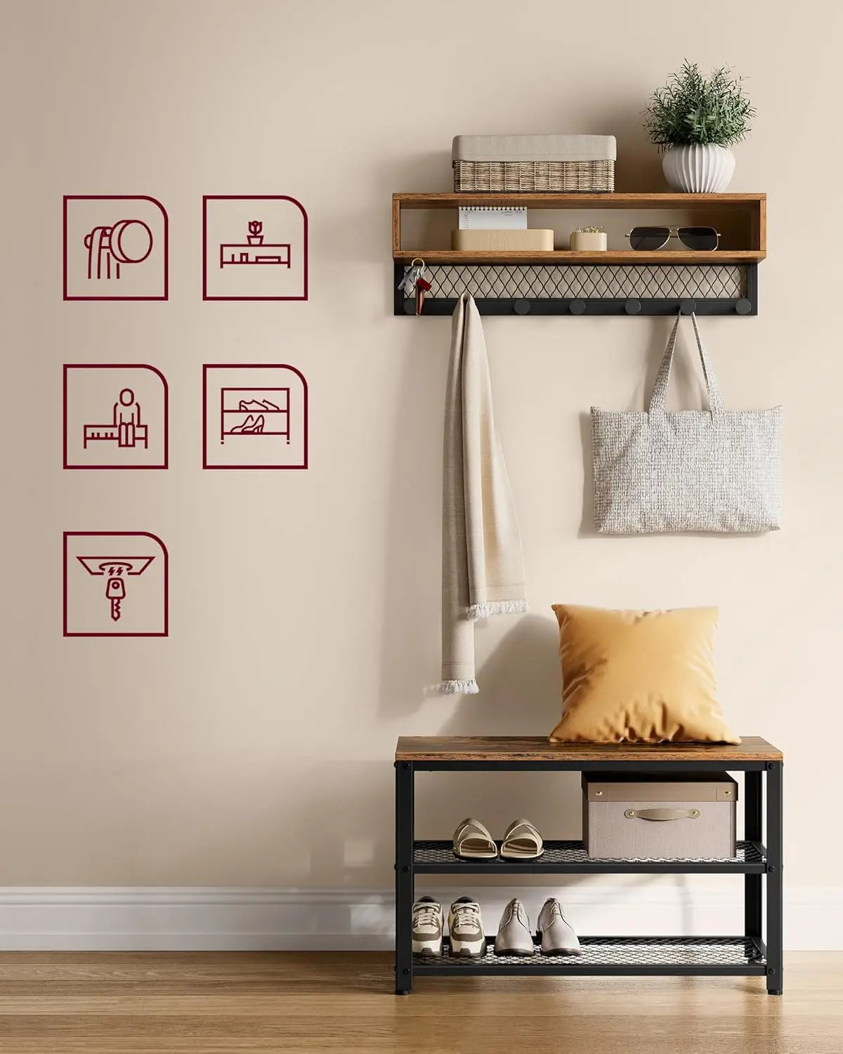 Das 5-in-1 Flurbaum-Set bietet Ihnen alles, was Sie für einen organisierten und stilvollen Flur benötigen. Es verfügt über ein doppellagiges Regal, ideal für Dekorationen oder persönliche Gegenstände, sowie über 7 Kleiderhaken, die ausreichend Platz für Taschen und Kleidung bieten. Zusätzlich sind 3 eingebaute Magneten perfekt für Ihre Schlüssel – so haben Sie alles Wichtige immer griffbereit.