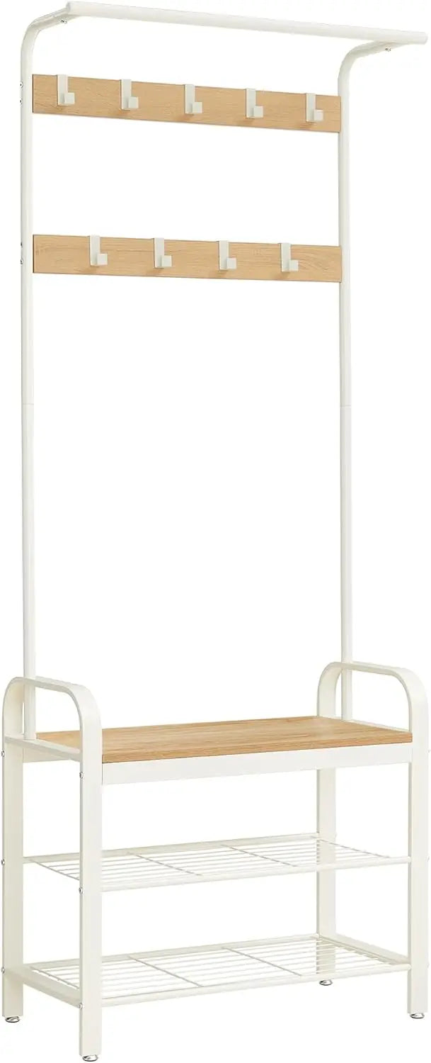 Platzsparendes 4‑in‑1-Design mit 9 abnehmbaren Haken und Kleiderstange, stabile Metallrahmen- und Holzkonstruktion mit 80-kg-Schuhbank für komfortables Sitzen, schnelle und einfache Montage dank bebilderter Anleitung