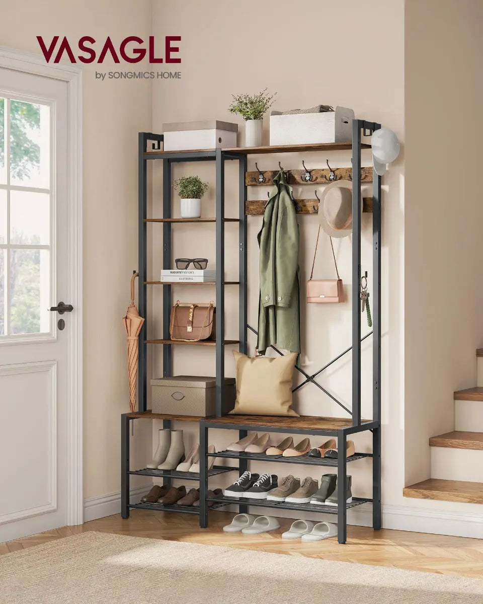 Verleihen Sie Ihrem Eingangsbereich mit dem SONGMICS Garderobenständer in vintagebraun-tintenschwarz einen Hauch von Eleganz und Funktionalität, während Sie gleichzeitig Platz sparen und Ordnung schaffen. Geniessen Sie den Komfort einer bequemen Bank und die praktische Aufbewahrung für Schuhe und Accessoires in einem stilvollen Design.