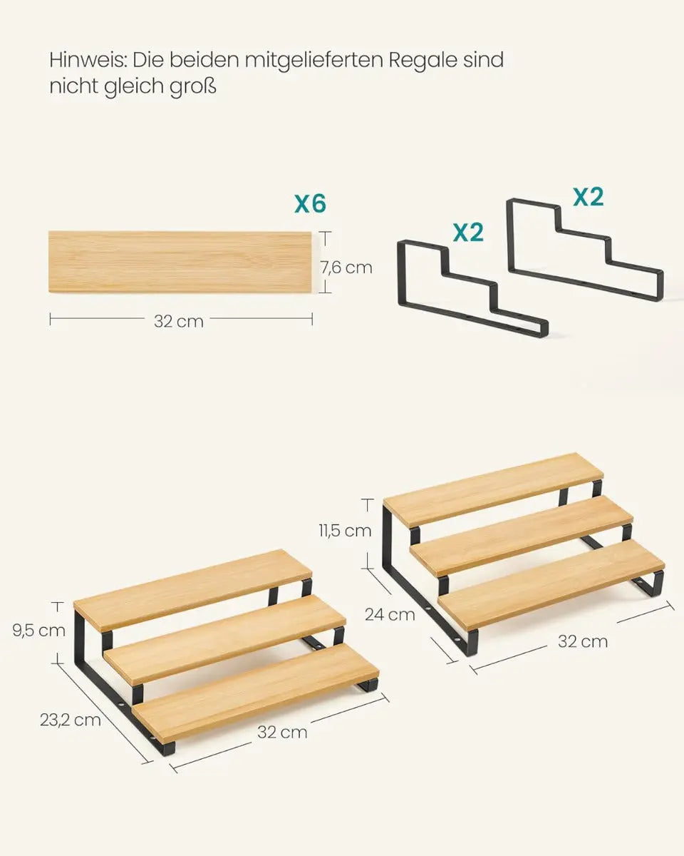 Jedes Regal verfügt über drei abgestufte Ebenen mit einer Tiefe von 7,6 cm – ideal, um Gläser und Dosen übersichtlich zu präsentieren. Ob einzeln genutzt, nebeneinandergestellt oder übereinander gestapelt: Die Regale lassen sich flexibel an deine Küche und deinen Stauraumbedarf anpassen. Das clevere Stecksystem ermöglicht auch den Einsatz an unterschiedlichen Orten – z. B. eines auf dem Tisch, das andere im Vorratsschrank.