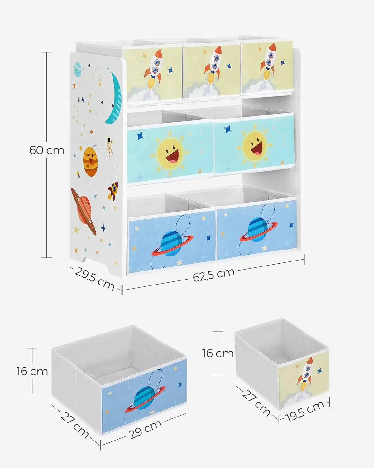 Kinderzimmerregal Weltall mit 7 Aufbewahrungsboxen Weiss