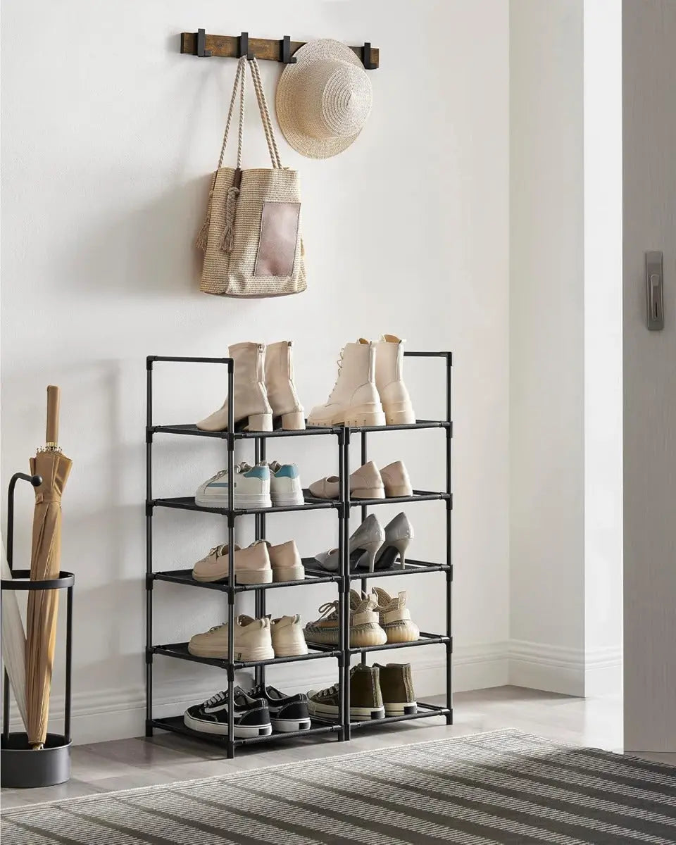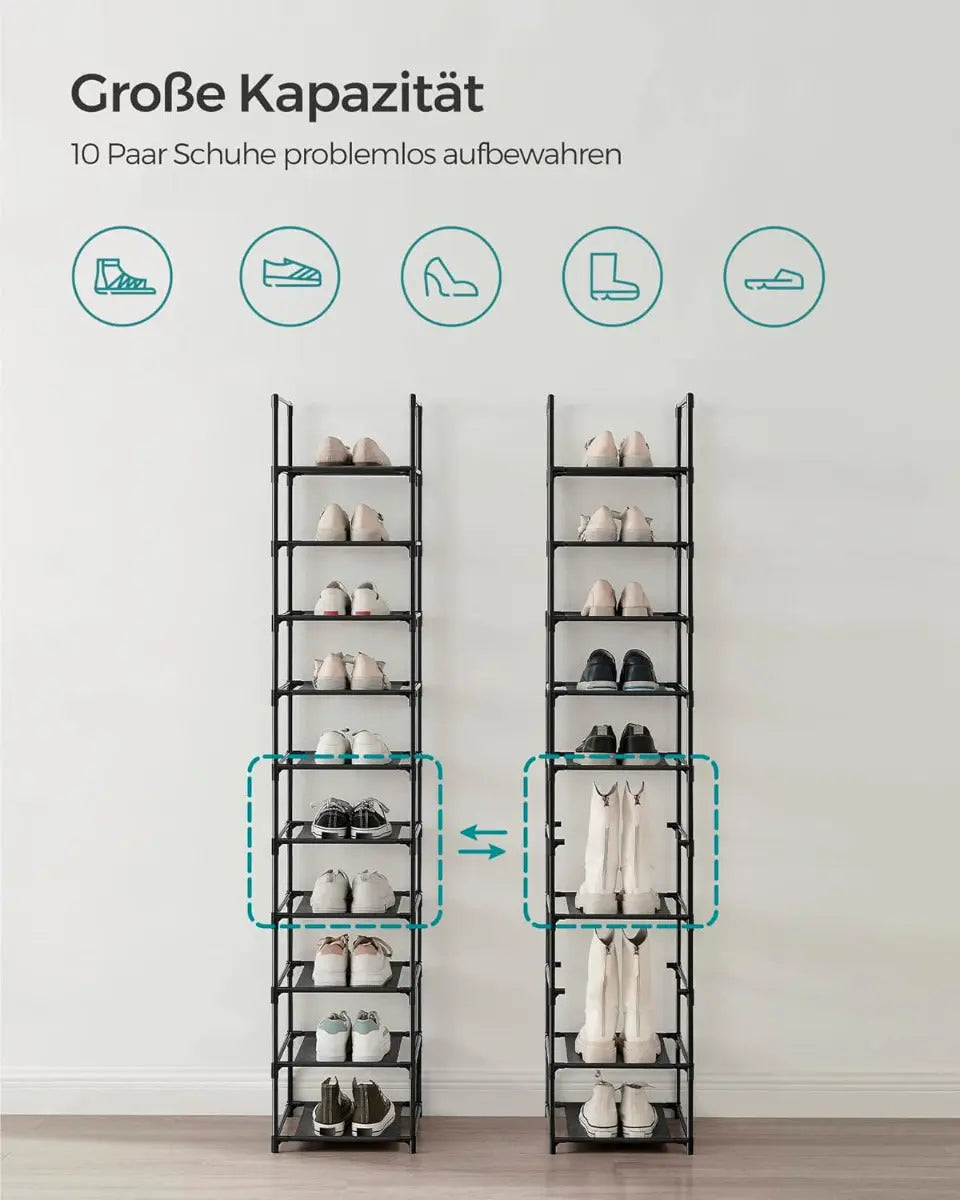 Bringen Sie Ordnung in Ihr Zuhause mit dem SONGMICS Schuhregal, das auf 10 Ebenen Platz für Ihre Lieblingsschuhe bietet und sich mühelos in jeden Raum integriert. Geniessen Sie die Kombination aus Stabilität, Langlebigkeit und einfacher Montage für eine stilvolle Schuhaufbewahrung.