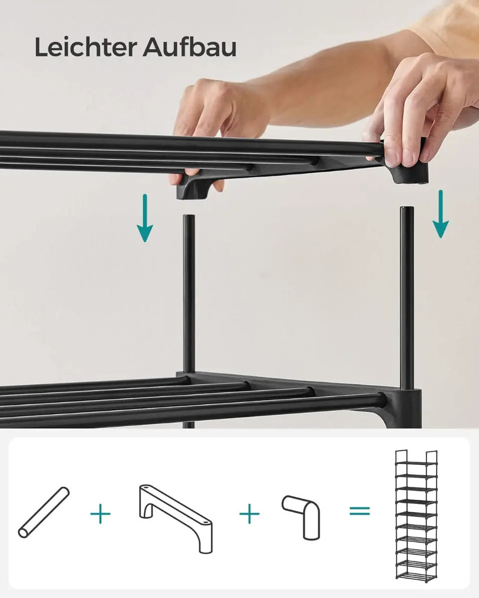 SONGMICS Schuhregal mit 10 Ebenen – offener Schuhschrank, höhenverstellbar, stapelbar, platzsparend, aus Metall, 30 × 45 × 174 cm, schwarz