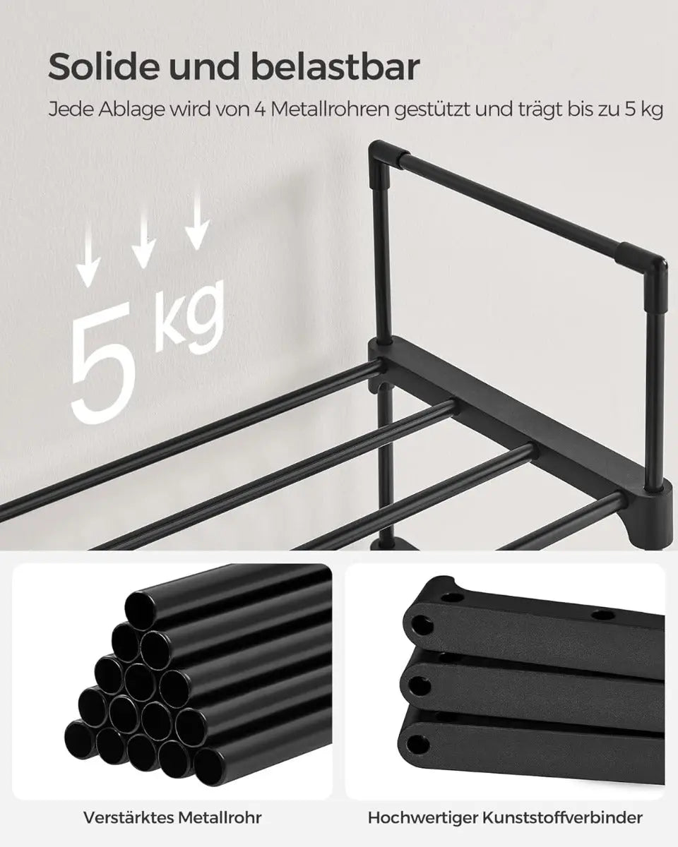 Die robuste Konstruktion aus verstärkten Metallrohren und langlebigen Kunststoffverbindern sorgt für Stabilität, während jede Ebene mit bis zu 5 kg belastbar ist. Die Ablagen sind flexibel einsetzbar: Möchten Sie höhere Stiefel oder grössere Gegenstände verstauen, lässt sich einfach eine Zwischenebene herausnehmen. Besonders praktisch: Das Regal kann auch in zwei kleinere Regale aufgeteilt und separat in verschiedenen Räumen verwendet werden – ganz wie es in Ihren Alltag passt.