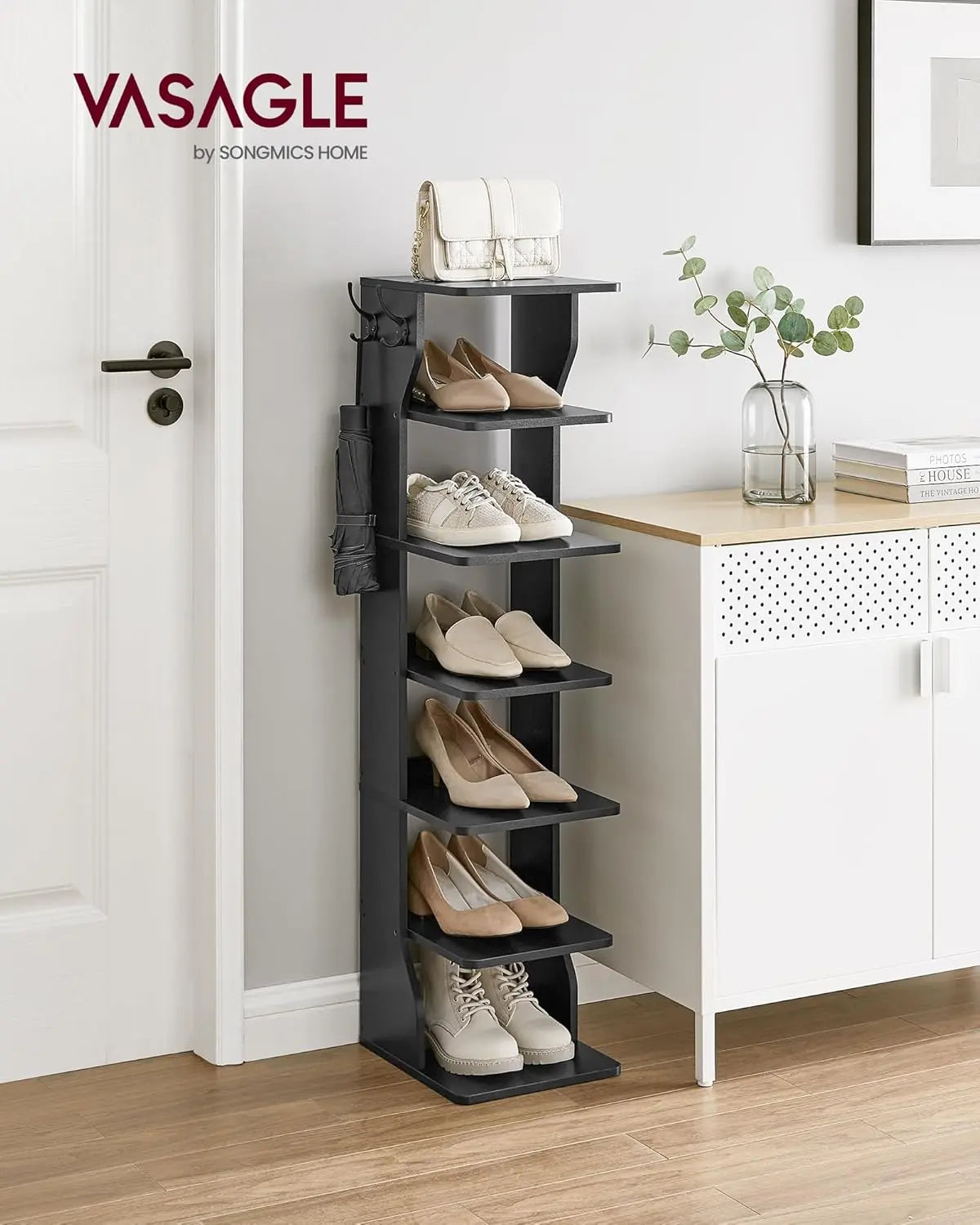 Verleihen Sie Ihrem Eingangsbereich mit dem SONGMICS Schuhregal schmal Stil und Funktionalität, während Sie Platz sparen und Ordnung schaffen. Nutzen Sie die 7 Ebenen für Ihre Schuhe und Dekorationen und profitieren Sie von praktischen Details wie den flexiblen Haken für Schlüssel und Geldbörsen.