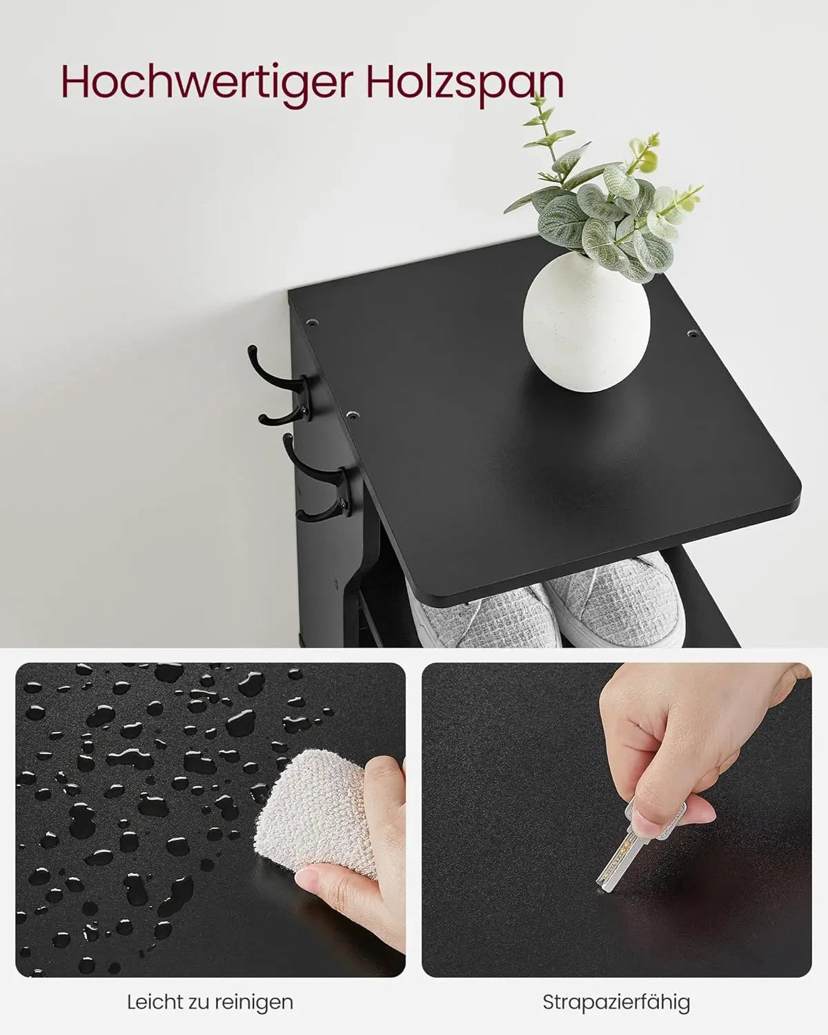 Praktische Details wie die zwei mitgelieferten Haken machen das SONGMICS Schuhregal noch funktionaler. Hängen Sie Ihre Schlüssel oder Geldbörsen einfach daran auf, um sie in der morgendlichen Hektik schnell zur Hand zu haben. Die Haken können flexibel links oder rechts angebracht werden, ganz nach Ihrem Bedarf.