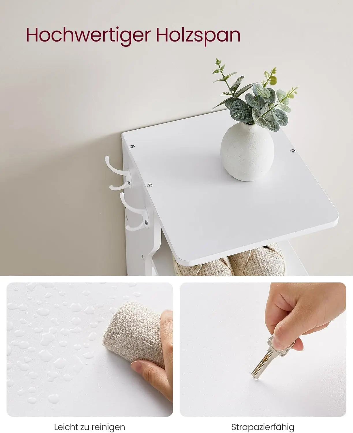 Praktisch und durchdacht: Das Regal kommt mit 2 Haken, an denen Sie Ihre Schlüssel und Geldbörsen aufhängen können. So haben Sie alles Wichtige in der morgendlichen Hektik schnell zur Hand. Die Haken sind flexibel und können je nach Bedarf links oder rechts montiert werden.