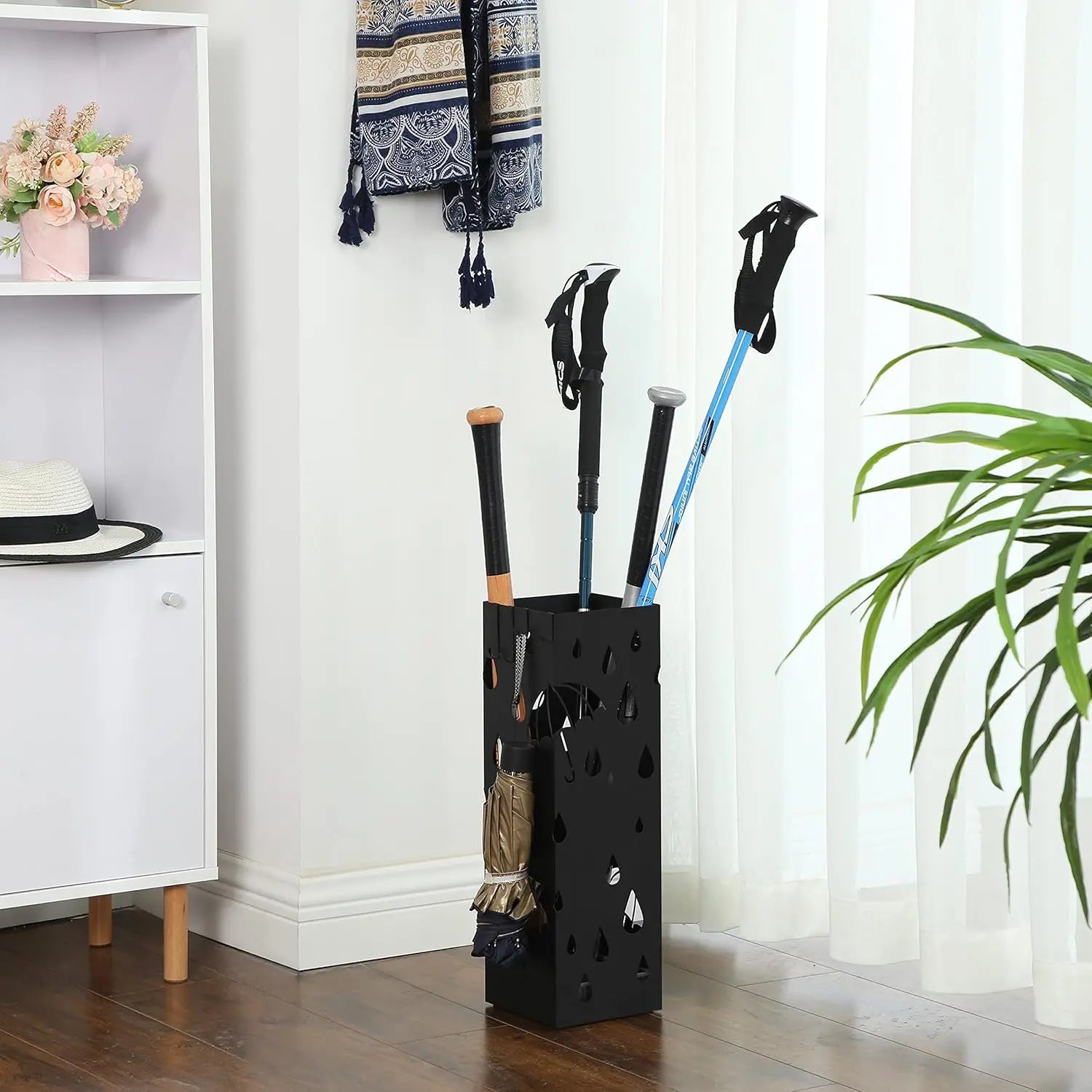 Der SONGMICS Schirmständer bietet ausreichend Platz für lange Schirme und ist mit 4 praktischen Haken ausgestattet – 2 lange und 2 kurze – um kleine Klappschirme ordentlich aufzuhängen. So bleibt alles an seinem Platz und der Schirmständer bleibt aufgeräumt.