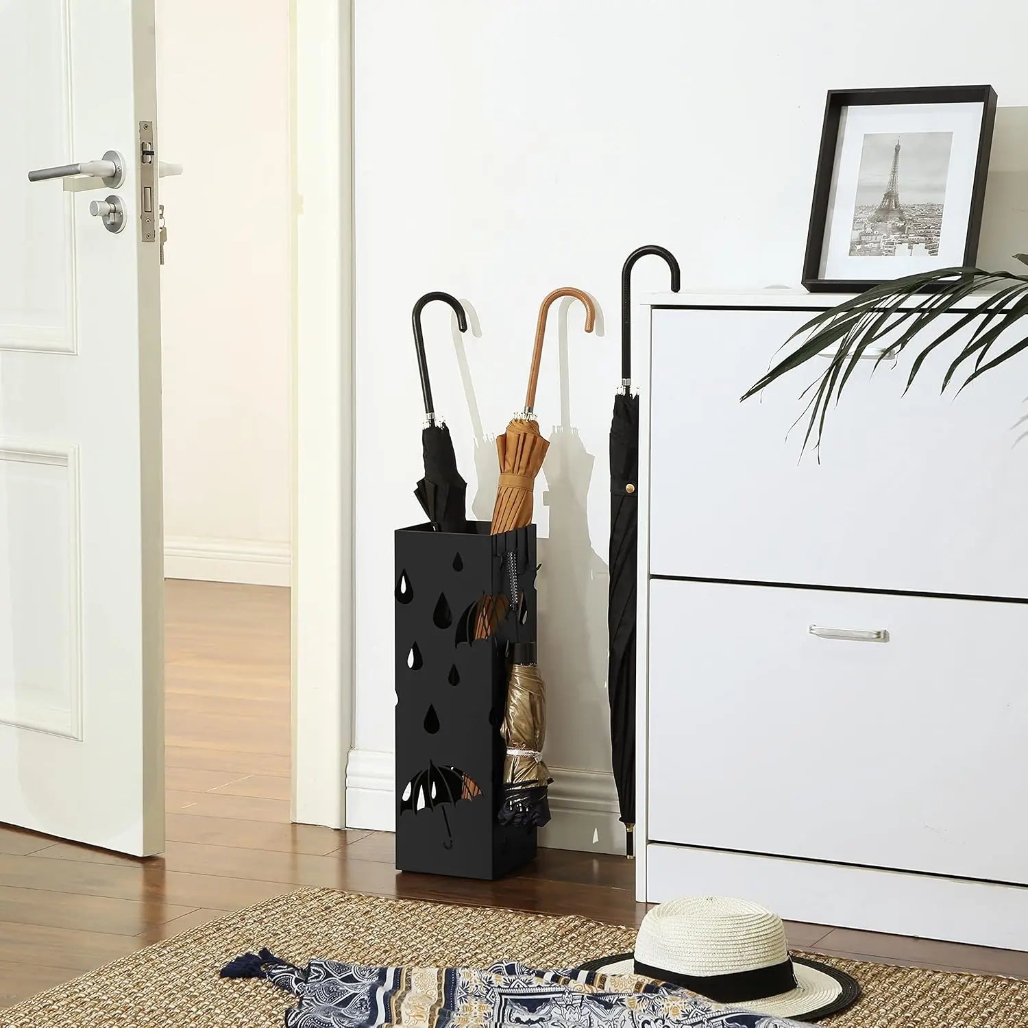 Kunden sind begeistert vom eleganten schwarzen Design und dem kunstvollen Cutout‑Look, der den Flur aufwertet. Besonders geschätzt werden die herausnehmbare Wasserauffangschale, die praktischen 4 Haken für lange und kurze Schirme, die kompakte Größe, die robuste Metallbauweise und die Anti‑Rutsch‑Pads.