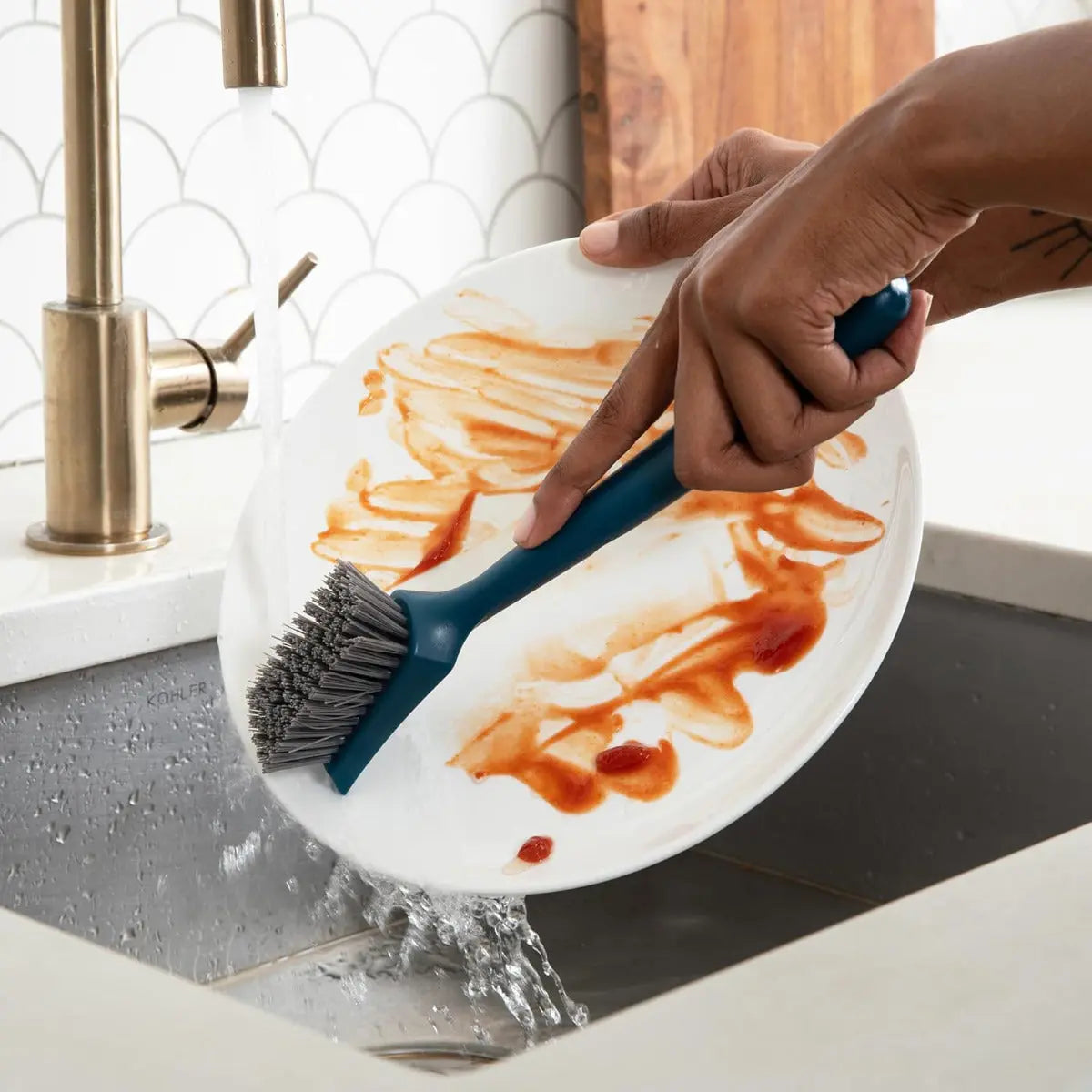 - DESIGN: Ergonomischer, komfortabler Griff, der das Handgelenk entlastet und weniger Kraftaufwand erfordert. Der schmale Bürstenkopf eignet sich ideal für schwer zugängliche Bereiche wie Stielgläser und Tassen. Integrierter Schaber zur mühelosen Entfernung hartnäckiger Rückstände.
