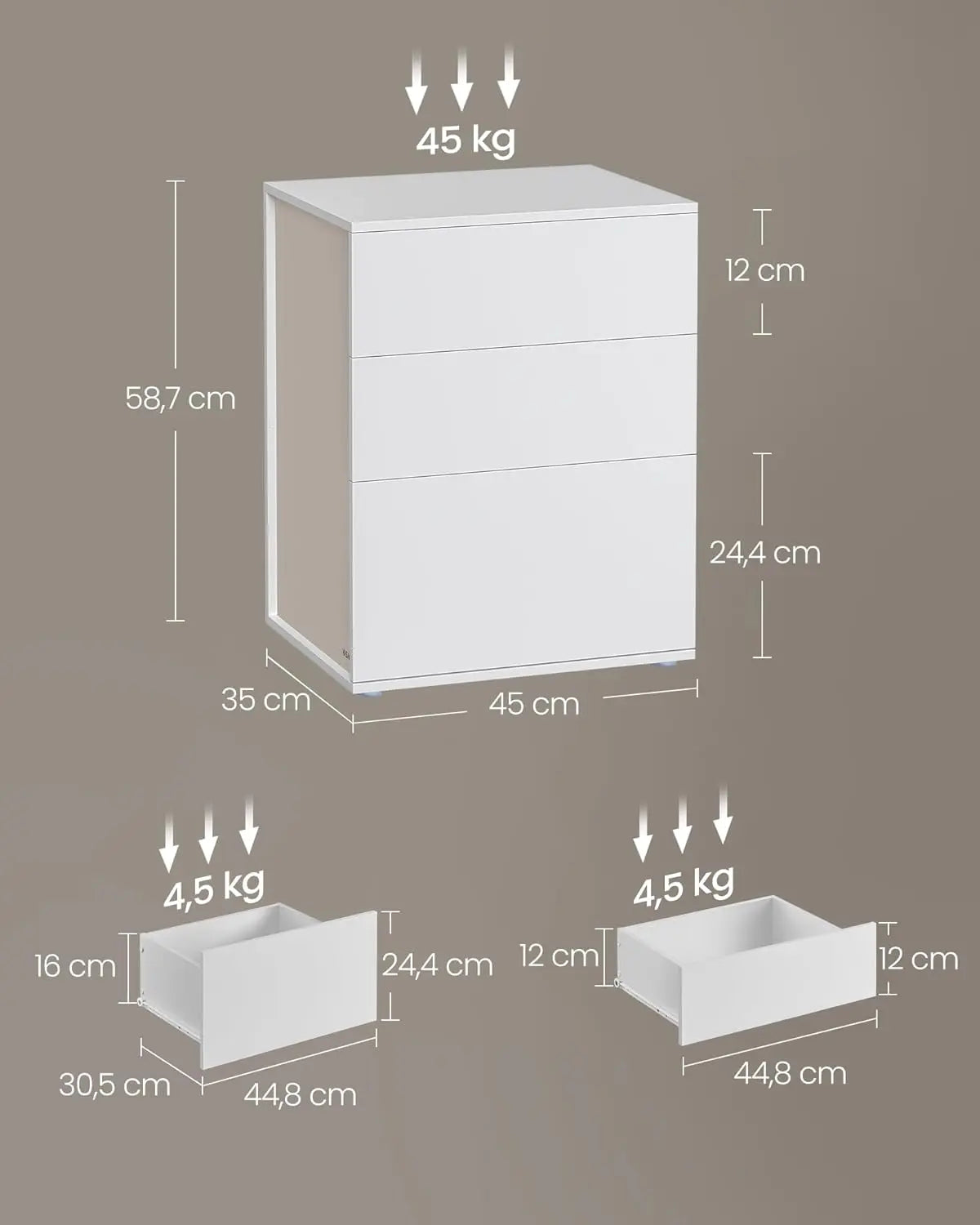 Toolless‑Montage in ca. 10 Minuten ohne Werkzeug, Drei geräumige Schubladen mit unterschiedlicher Größe für übersichtlichen Stauraum, Trägt bis 59 kg mit Fusspads zum Schutz vor Kratzern